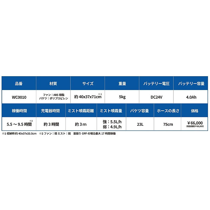 | カラー・仕様・サイズ | カラー:グレー 素材 ファン:ABS樹脂 バケツ:ポリプロピレン サイズ:約40×37×71cm(収納時-約40×37×33.5cm) 重量:約5kg 付属品:バッテリーパック/バッテリー充電器/交換用ノズル4個/取扱説明書 生産国:中国製 |