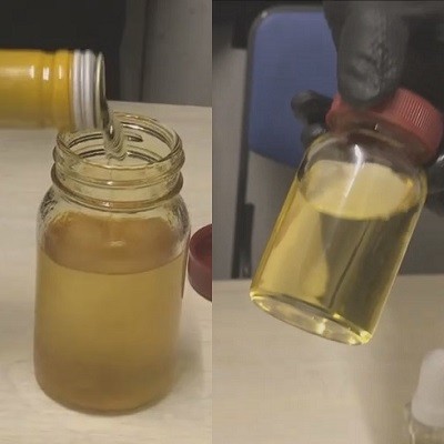 | 混合燃料 フラッシュZはFCR-062 燃料添加剤を配合しており、エンジン内をクリーンに保ち、翌シーズンのエンジン始動がスムーズになります。 | 劣化ガソリンを再現した状態です。 ガソリンタンク内に残ったガソリンは少量であっても、オフシーズンなどで長期間放置しているとこのように劣化し、タール状のネバネバしたスラッジが発生します。 このネバネバがキャブレターに詰まると、翌シーズンの始動時に、不調を起こします。 | ガソリンは一度劣化すると、新しいガソリンを継ぎ足しても、ネバネバしたスラッジはなかなか取れません。 その上、新しいガソリンの劣化を早めてしまいます。また、劣化したガソリンは、エンジン内の腐食の原因にもなります。 | この状態にFCR-062 燃料添加剤を入れると、ネバネバした塊が、ガソリンときれいに溶け合いました。 この状態でガソリンが燃焼すれば、デポジットの生成や付着を防止し、翌シーズンのエンジン始動がスムーズになります。また、使い続けることでエンジン内をクリーンに保てます。 |