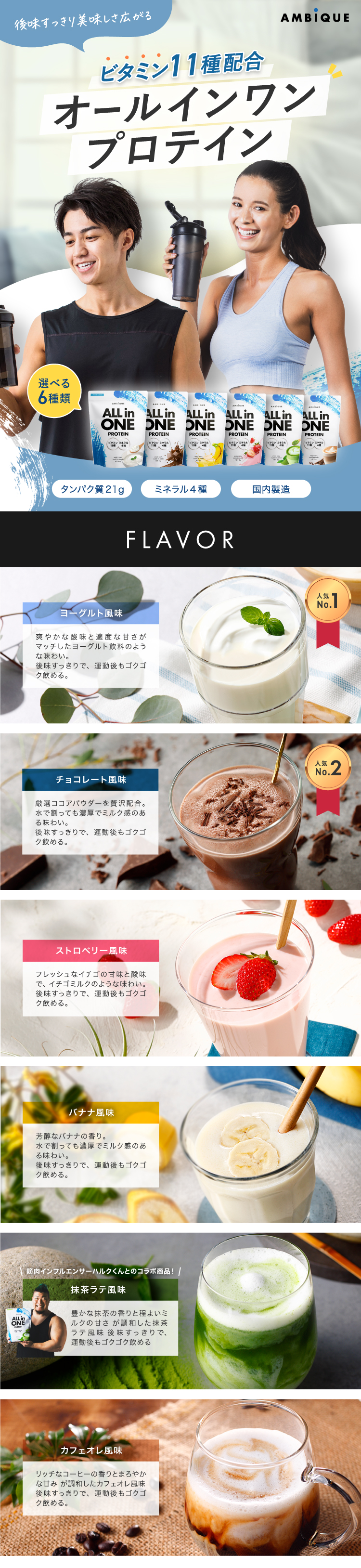 乳清たんぱく(乳成分を含む)(アメリカ製造)、果糖、バナナパウダー(バナナを含む)、粉末油脂、ドロマイト、食塩、亜鉛含有酵母/香料、乳化剤(大豆由来)、甘味料(ステビア、スクラロース、アセスルファムK)、酸味料、V.C、加工でんぷん、トレハロース、ナイアシン、カゼインNa、クエン酸鉄、V.E、パントテン酸カルシウム、V.B2、V.B6、V.A、V.B1、葉酸、V.D、V.B12