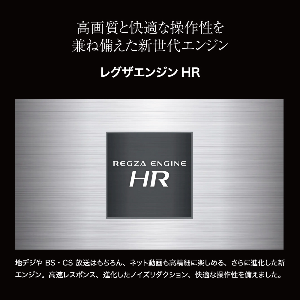 | 【レグザエンジンHR】 地デジやBS・CS放送はもちろん、ネット動画も高精細に楽しめる、さらに進化した新エンジン。高速レスポンス、進化したノイズリダクション、快適な操作性を備えました。 |