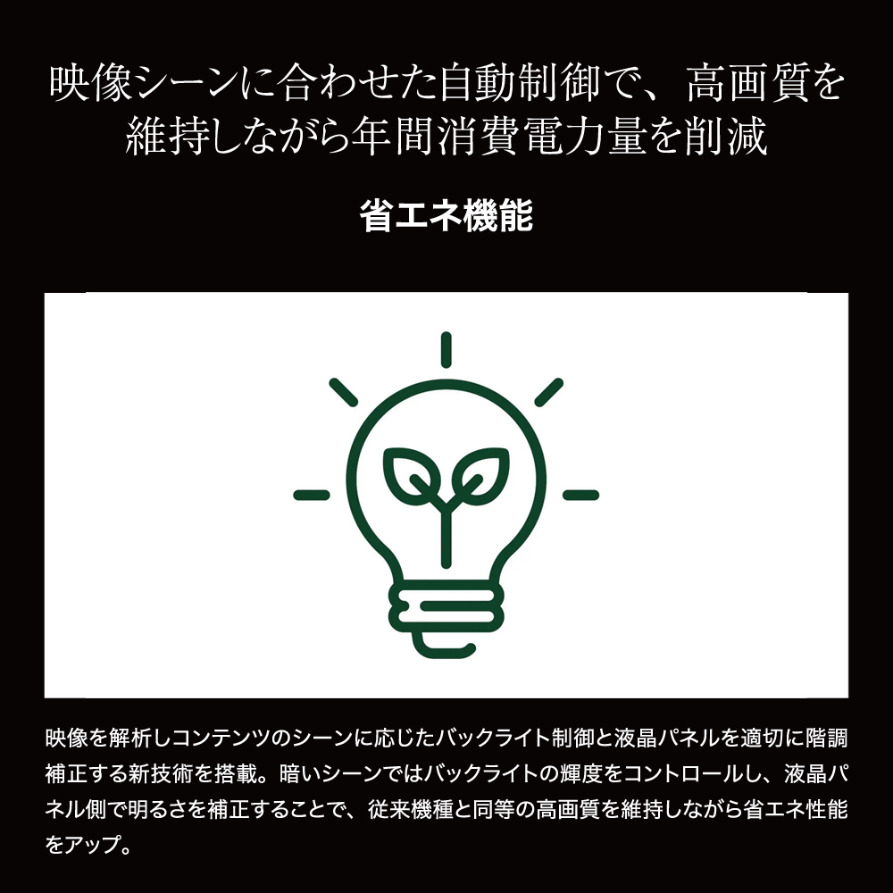 | 【省エネ機能】 映像を解析しコンテンツのシーンに応じたバックライト制御と液晶パネルを適切に階調補正する新技術を搭載。暗いシーンではバックライトの輝度をコントロールし、液晶パネル側で明るさを補正することで、従来機種と同等の高画質を維持しながら省エネ性能をアップ。 |