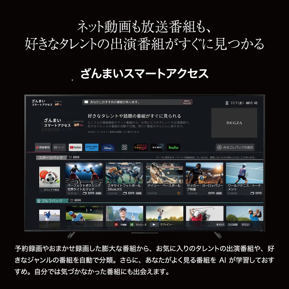 | 【ざんまいスマートアクセス】 予約録画やおまかせ録画した膨大な番組から、お気に入りのタレントの出演番組や、好きなジャンルの番組を自動で分類。さらに、あなたがよく見る番組をAIが学習しておすすめ。自分では気づかなかった番組にも出会えます。 |