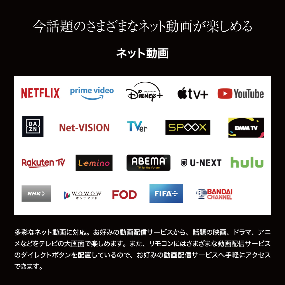 | 【ネット動画】 多彩なネット動画に対応。お好みの動画配信サービスから、話題の映画、ドラマ、アニメなどをテレビの大画面で楽しめます。また、リモコンにはさまざまな動画配信サービスのダイレクトボタンを配置しているので、お好みの動画配信サービスへ手軽にアクセスできます。 |