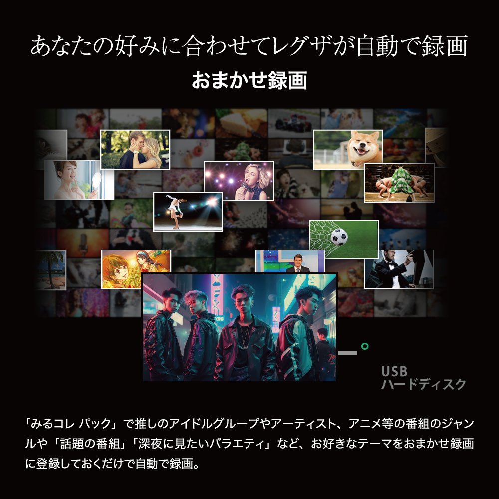 | 【おまかせ録画】 「みるコレ パック」で推しのアイドルグループやアーティスト、アニメ等の番組のジャンルや「話題の番組」「深夜に見たいバラエティ」など、お好きなテーマをおまかせ録画に登録しておくだけで自動で録画。 |