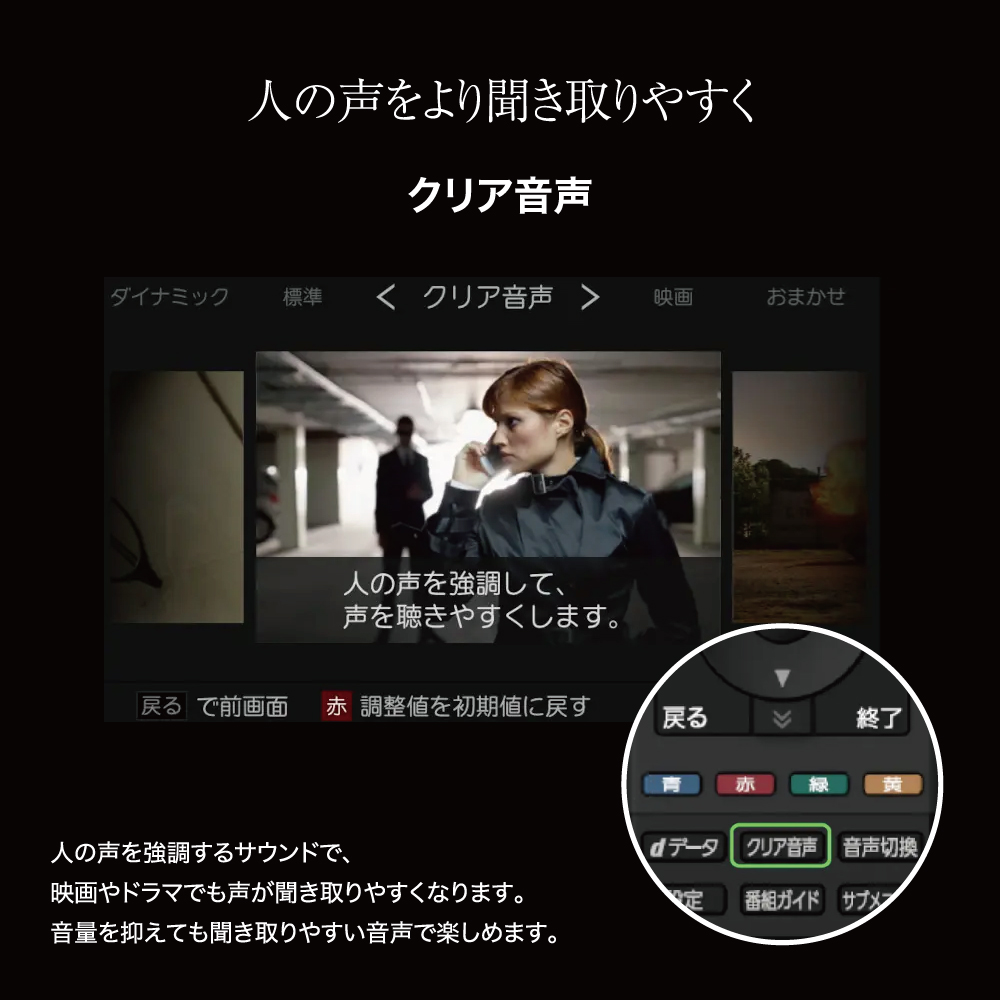 | 【クリア音声】 人の声を強調するサウンドで、映画やドラマでも声が聞き取りやすくなります。音量を抑えても聞き取りやすい音声で楽しめます。 |