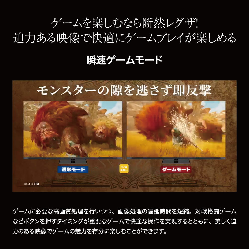 | 【瞬速ゲームモード】 ゲームに必要な高画質処理を行いつつ、画像処理の遅延時間を短縮。対戦格闘ゲームなどボタンを押すタイミングが重要なゲームで快適な操作を実現するとともに、美しく迫力のある映像でゲームの魅力を存分に楽しむことができます。 |