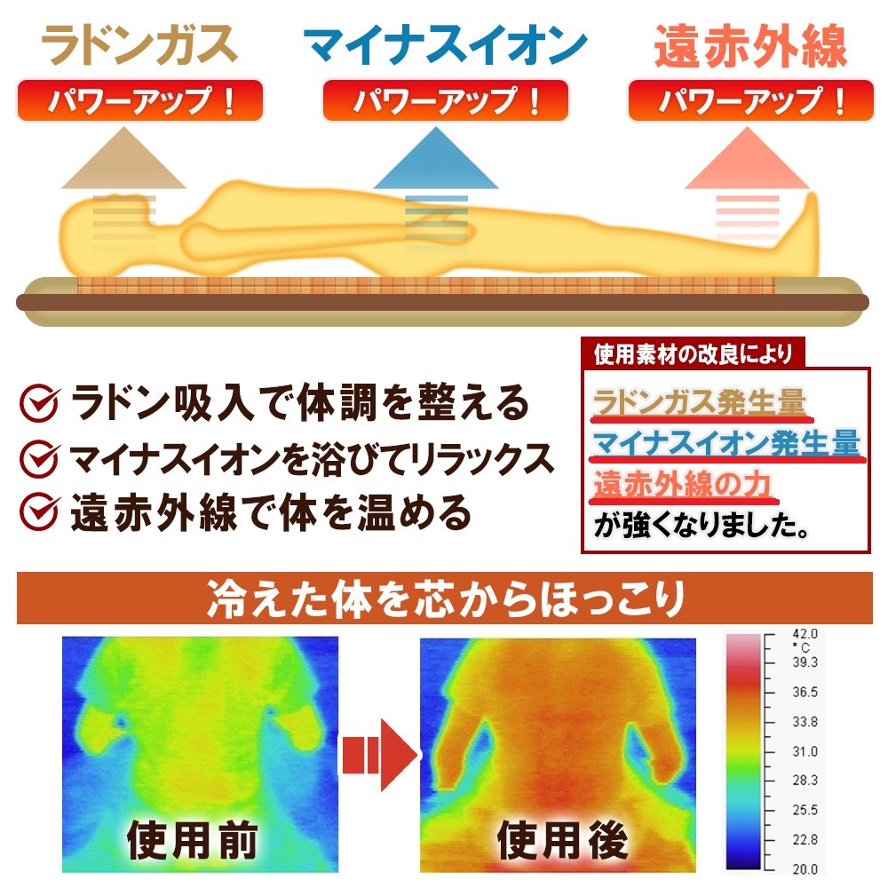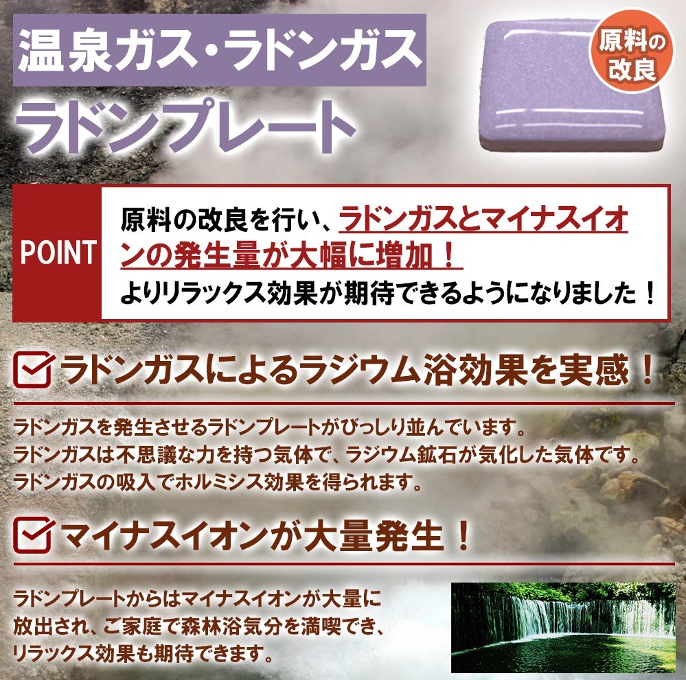 森林、滝、噴水公園の近くには多くのマイナスイオンが発生しています。ラジウム岩盤浴マットは大量のマイナスイオンを放出していますので寝ている間、大量のマイナスイオンを浴びることができます。