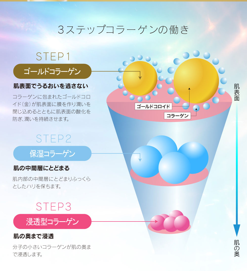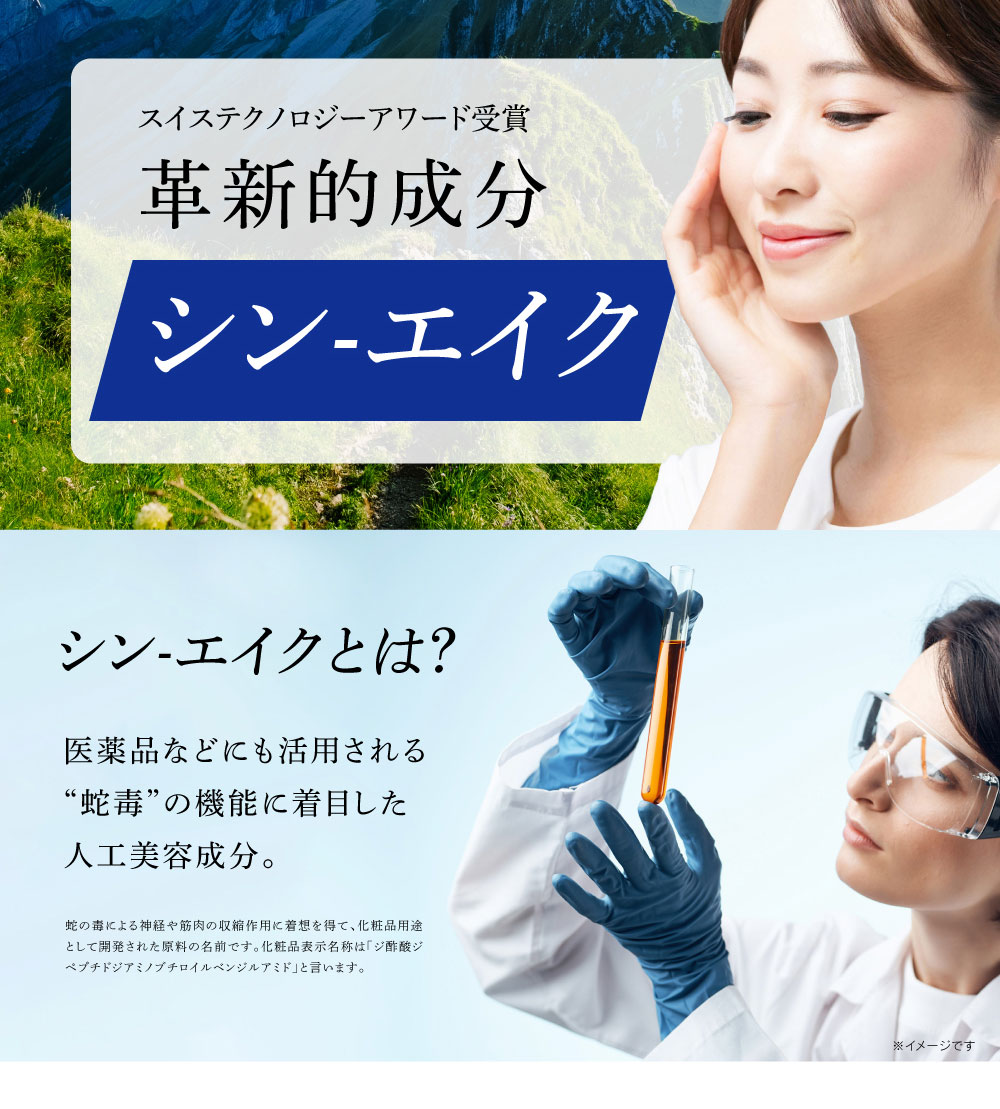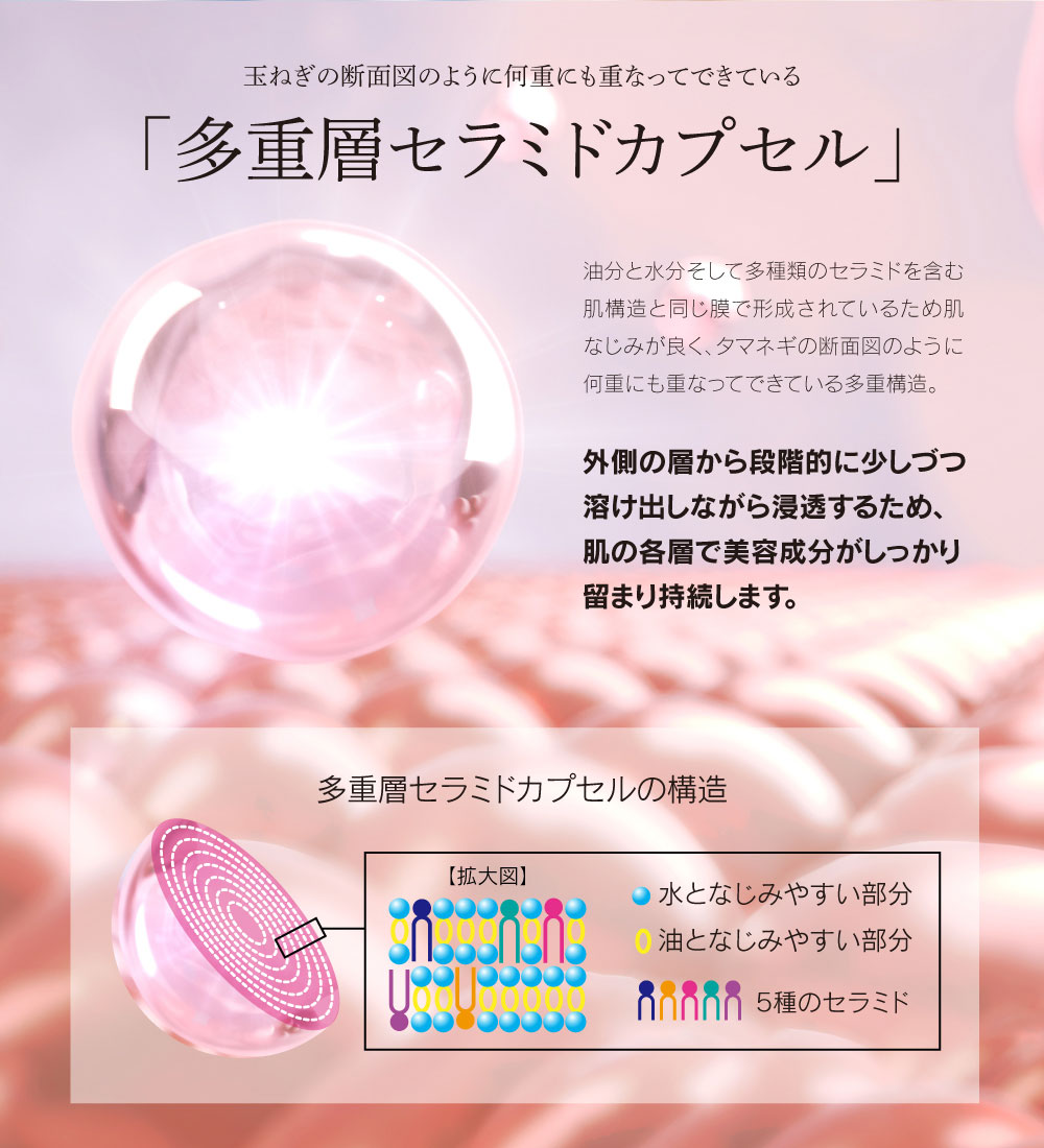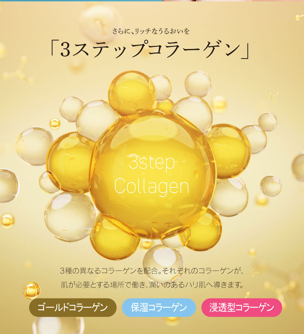 | 成分 | 水、グリセリン、BG、コハク酸ジエトキシエチル、1,2-ヘキサンジオール、グリコシルトレハロース、金、セラミド1、セラミド2、セラミド3、セラミド5、セラミド6、アセチルヘキサペプチド-8、ヒポファエラムノイデス果実油、ジ酢酸ジペプチドジアミノブチロイルベンジルアミド、アセチルヒアルロン酸Na、加水分解オクラ種子エキス、カンゾウ根エキス、コメヌカ油、プエラリアミリフィカ根エキス、スーパーオキシドジスムターゼ、コンドロイチン硫酸Na、加水分解水添デンプン、トコトリエノール、トコフェロール、ポリクオタニウム-61、ポリクオタニウム-51、デキストリン、水添レチノール、トリ(カプリル酸/カプリン酸)グリセリル、加水分解コラーゲン、水溶性コラーゲン、サクシノイルアテロコラーゲン、セリン、リン脂質、スフィンゴ脂質、ダイズステロール、炭酸水素Na、スクワラン、シクロヘキサシロキサン、シクロペンタシロキサン、カルボマー、キサンタンガム、セルロースガム、水酸化K、PPG-4セテス-20、ミリスチン酸ポリグリセリル-10、ペンチレングリコール、水添レシチン、ペンテト酸5Na、フェノキシエタノール |