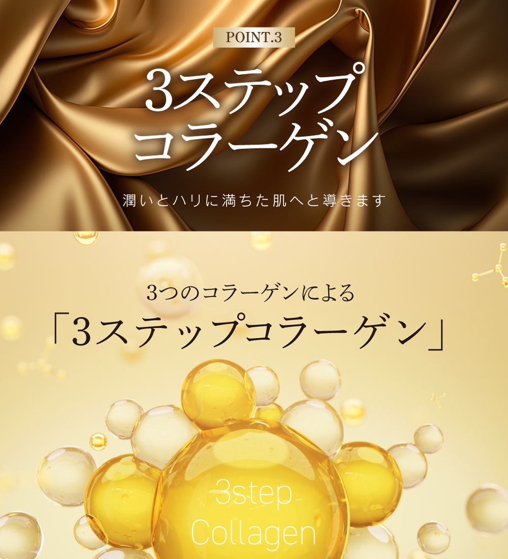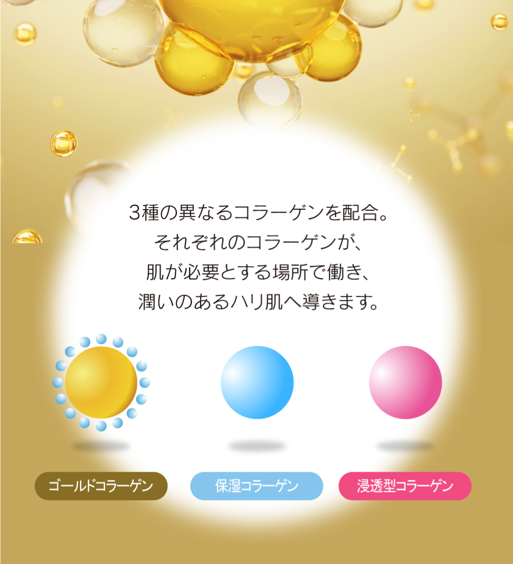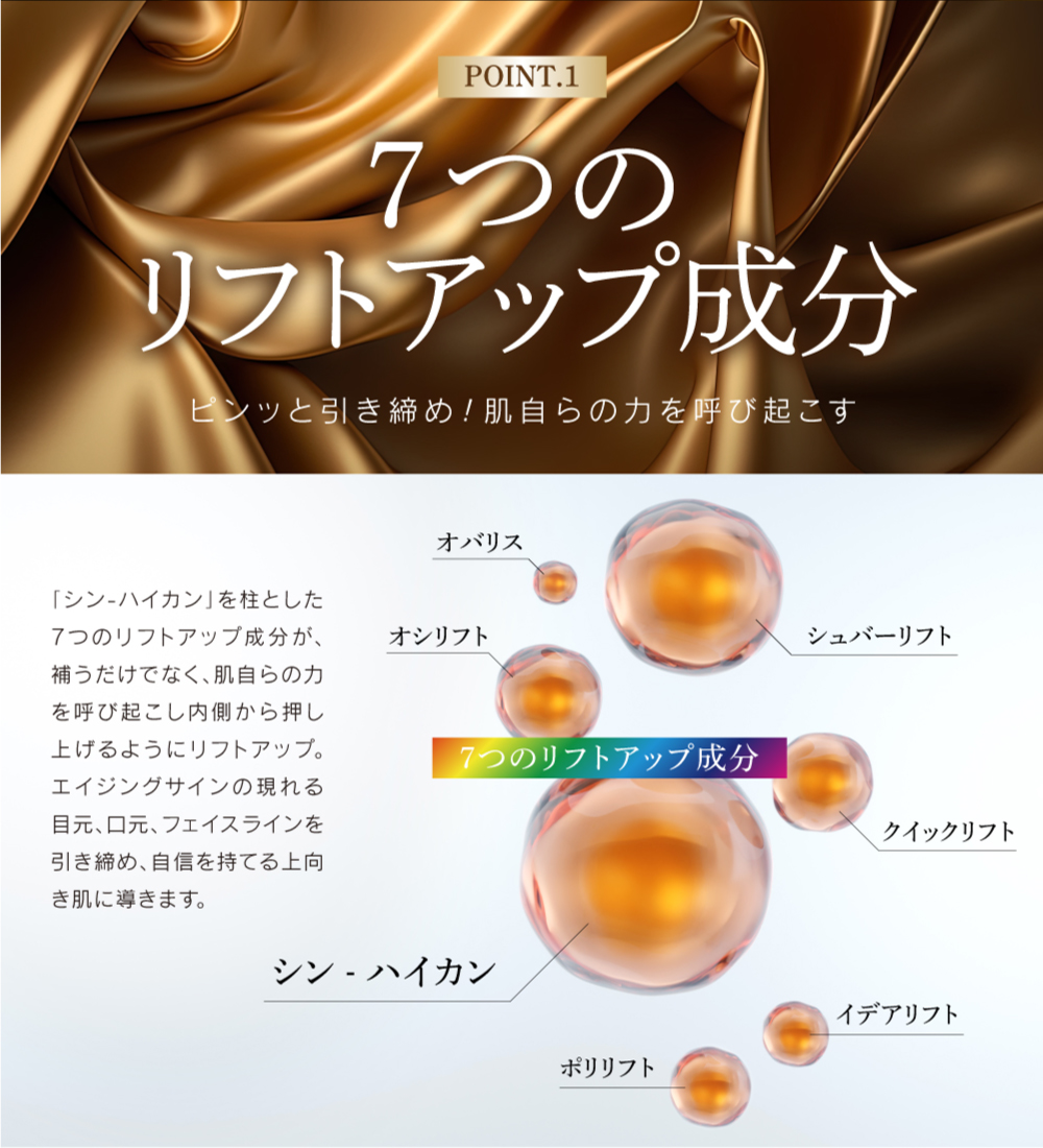 | 成分 | 水、グリセリン、DPG、グリコシルトレハロース、1,2-ヘキサンジオール、加水分解水添デンプン、アセチルジペプチド-1セチル、ラウリン酸ソルビタン、コルクガシ樹皮エキス、セラミド1、セラミド2、セラミド3、セラミド5、セラミド6、ダイズステロール、水添レシチン、トリフルオロ酢酸テトラデシルアミノブチロイルバリルアミノ酪酸ウレア、加水分解コラーゲン、水溶性コラーゲン、サクシノイルアテロコラーゲン、(ジヒドロキシメチルシリルプロポキシ)ヒドロキシプロピル加水分解コラーゲン、オリゴペプチド-6、金、白金、ポリソルベート80、ヒアルロン酸Na、加水分解ヒアルロン酸、スクワラン、グラウシン、アーモンドエキス、カラスムギ穀粒エキス、エチルヘキシルグリセリン、ポリ-γ-グルタミン酸Na、ダイズ種子エキス、セリン、リン脂質、スフィンゴ脂質、ヤシ油アルキルグルコシド、ユビキノン、マンニトール、セルロース、酸化鉄、ヒドロキシプロピルメチルセルロース、キサンタンガムクロスポリマー、炭酸水素Na、ジカプリン酸ネオペンチルグリコール、ヒドロキシエチルセルロース、カプリリルグリコール、トコフェロール、シクロヘキサシロキサン、シクロペンタシロキサン、カルボマー、BG、PEG-20水添ヒマシ油、キサンタンガム、ミリスチン酸ポリグリセリル-10、ラウリン酸ポリグリセリル-10、水酸化K、ペンテト酸5Na、PPG-4セテス-20、ペンチレングリコール、エタノール、フェノキシエタノール |