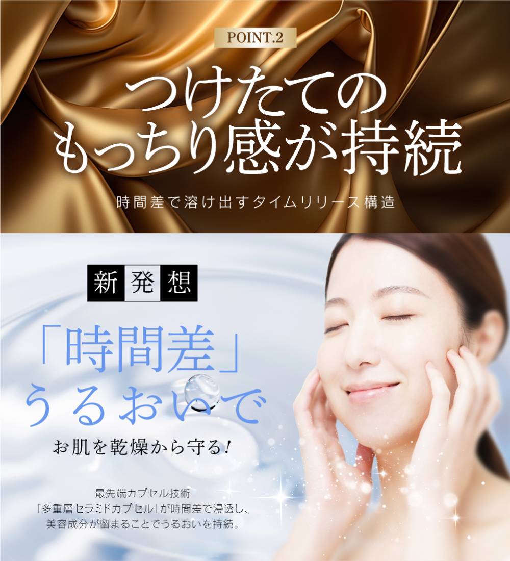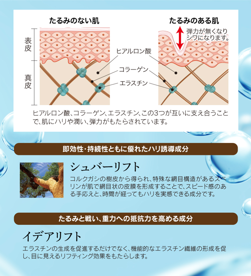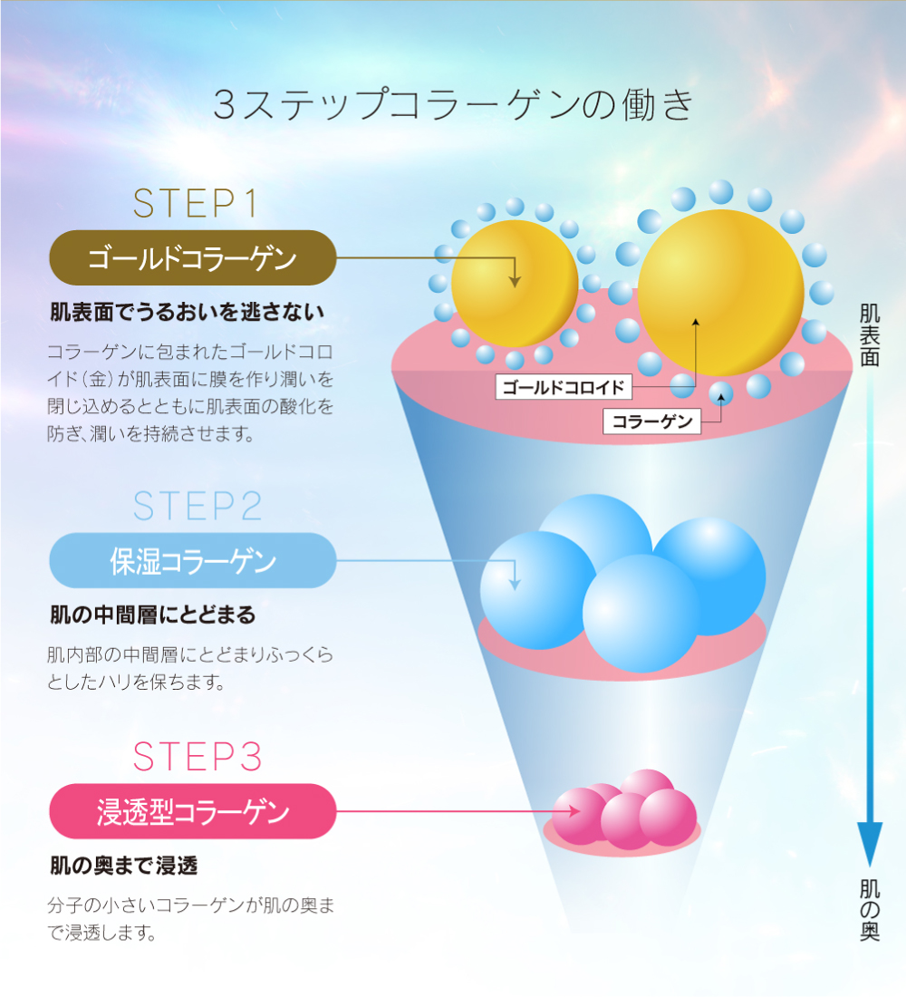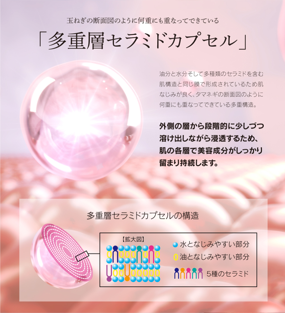 | 成分 | 水、グリセリン、DPG、グリコシルトレハロース、1,2-ヘキサンジオール、加水分解水添デンプン、アセチルジペプチド-1セチル、ラウリン酸ソルビタン、コルクガシ樹皮エキス、セラミド1、セラミド2、セラミド3、セラミド5、セラミド6、ダイズステロール、水添レシチン、トリフルオロ酢酸テトラデシルアミノブチロイルバリルアミノ酪酸ウレア、加水分解コラーゲン、水溶性コラーゲン、サクシノイルアテロコラーゲン、(ジヒドロキシメチルシリルプロポキシ)ヒドロキシプロピル加水分解コラーゲン、オリゴペプチド-6、金、白金、ポリソルベート80、ヒアルロン酸Na、加水分解ヒアルロン酸、スクワラン、グラウシン、アーモンドエキス、カラスムギ穀粒エキス、エチルヘキシルグリセリン、ポリ-γ-グルタミン酸Na、ダイズ種子エキス、セリン、リン脂質、スフィンゴ脂質、ヤシ油アルキルグルコシド、ユビキノン、マンニトール、セルロース、酸化鉄、ヒドロキシプロピルメチルセルロース、キサンタンガムクロスポリマー、炭酸水素Na、ジカプリン酸ネオペンチルグリコール、ヒドロキシエチルセルロース、カプリリルグリコール、トコフェロール、シクロヘキサシロキサン、シクロペンタシロキサン、カルボマー、BG、PEG-20水添ヒマシ油、キサンタンガム、ミリスチン酸ポリグリセリル-10、ラウリン酸ポリグリセリル-10、水酸化K、ペンテト酸5Na、PPG-4セテス-20、ペンチレングリコール、エタノール、フェノキシエタノール |