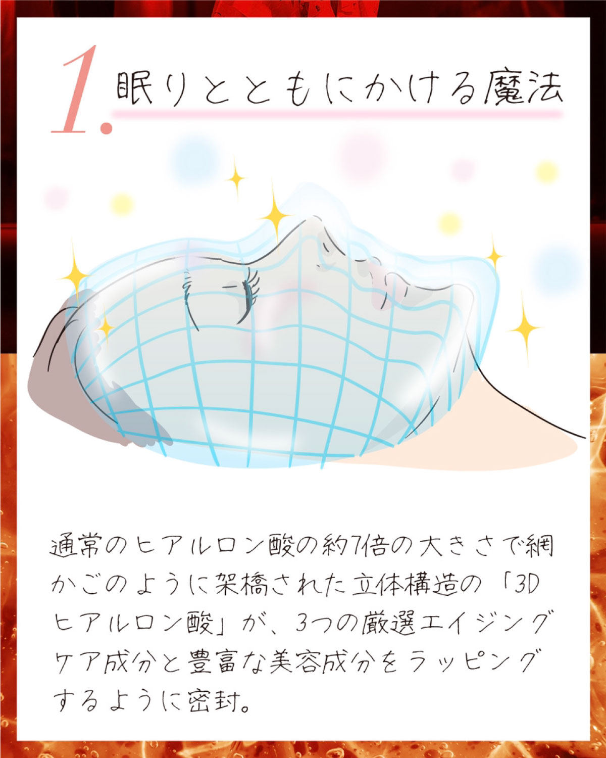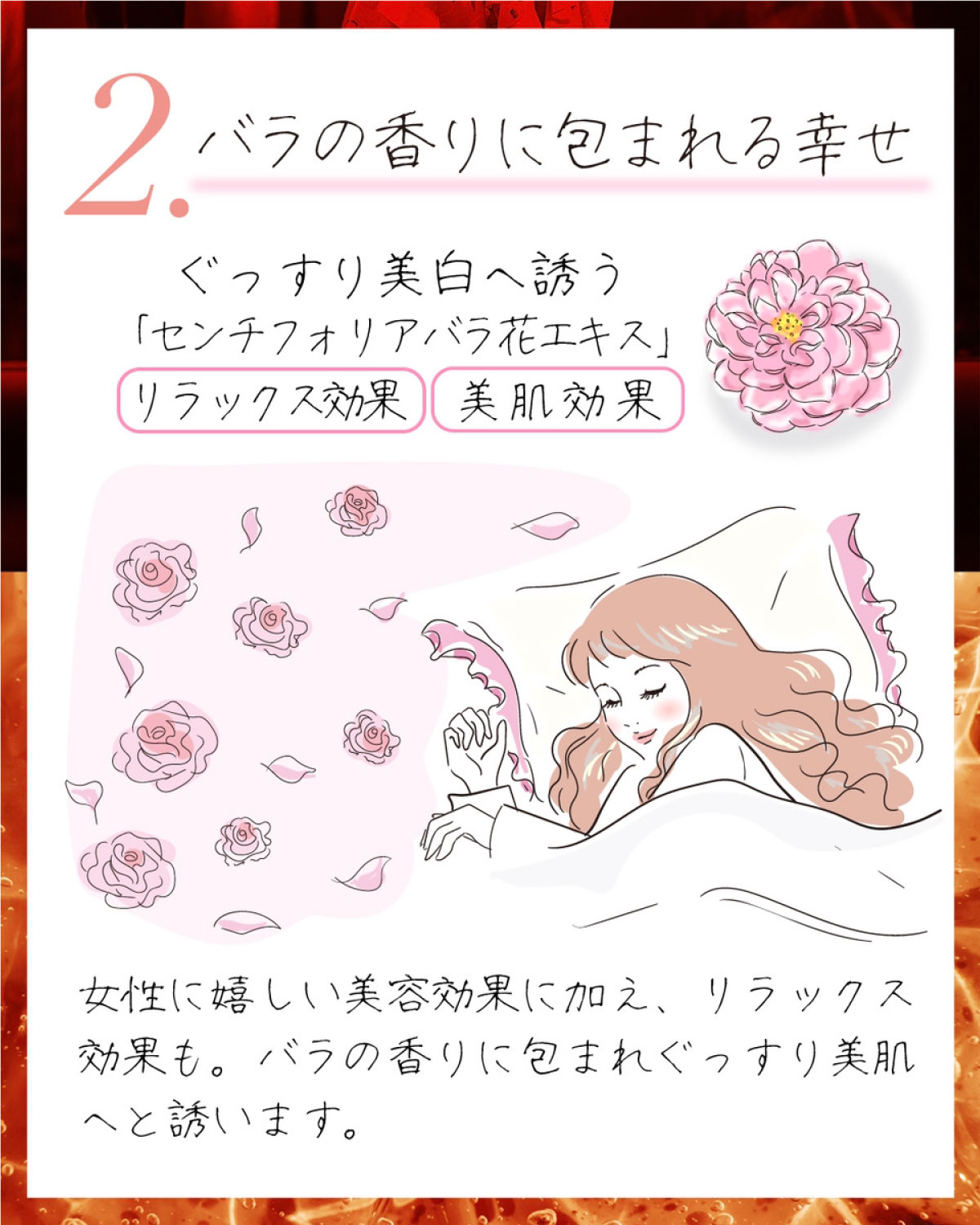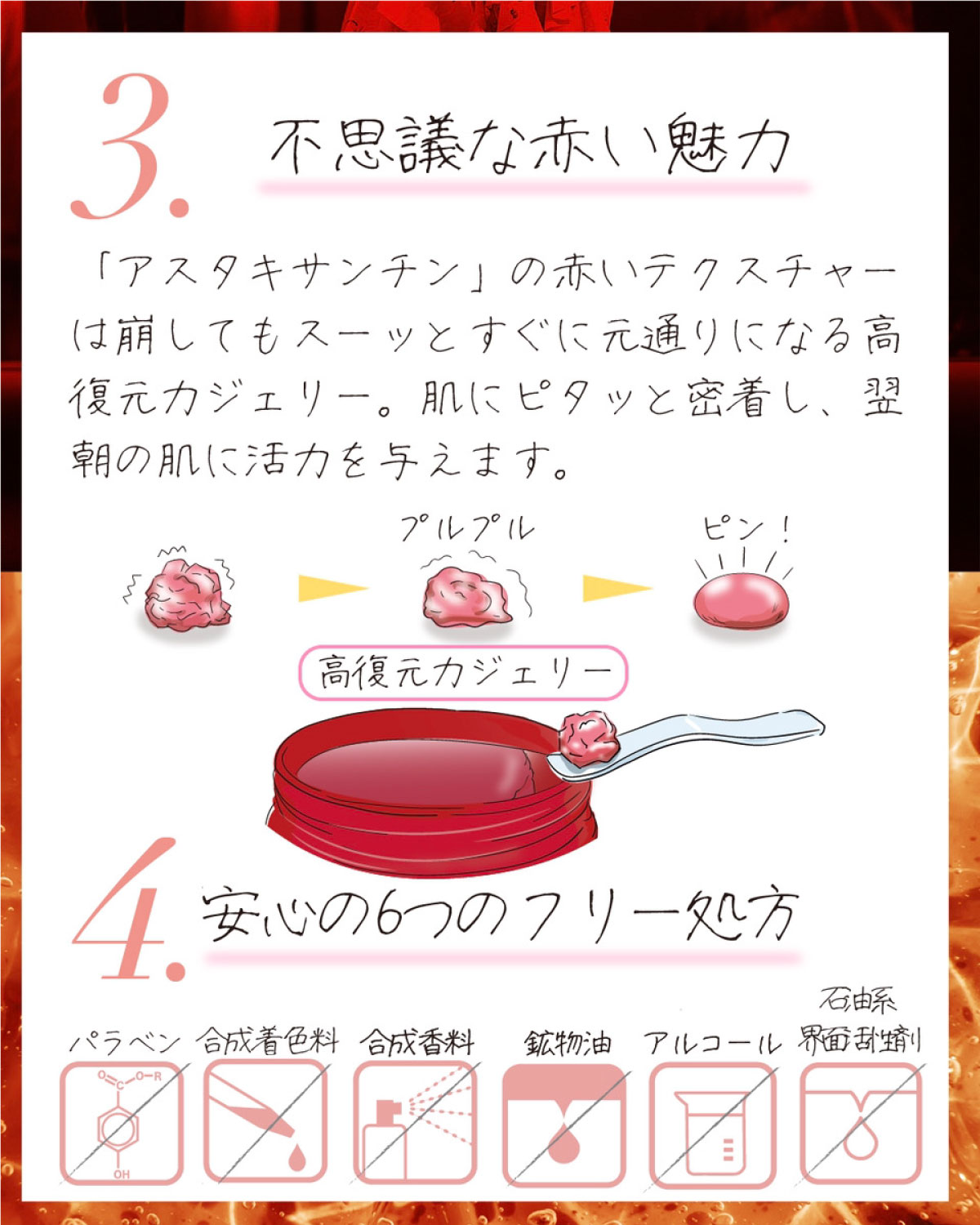 | 成分 | 水、グリセリン、1,2-ヘキサンジオール、(PEG-240/デシルテトラデセス-20/HDI)コポリマー、DPG、グルコシルルチン、ユーグレナエキス、ワイルドタイムエキス、トリフルオロ酢酸テトラデシルアミノブチロイルバリルアミノ酪酸ウレア、ジ酢酸ジペプチドジアミノブチロイルベンジルアミド、加水分解サケ卵巣膜エキス、トリフルオロアセチルトリペプチド−2、アセチルヒアルロン酸Na、加水分解ヒアルロン酸、ヒアルロン酸クロスポリマーNa、アスタキサンチン、センチフォリアバラ花エキス、トリ(カプリル酸/カプリン酸)グリセリル、デキストラン、BG、ペンチレングリコール、PEG-60水添ヒマシ油、クエン酸、クエン酸Na、ペンテト酸5Na、フェノキシエタノール |