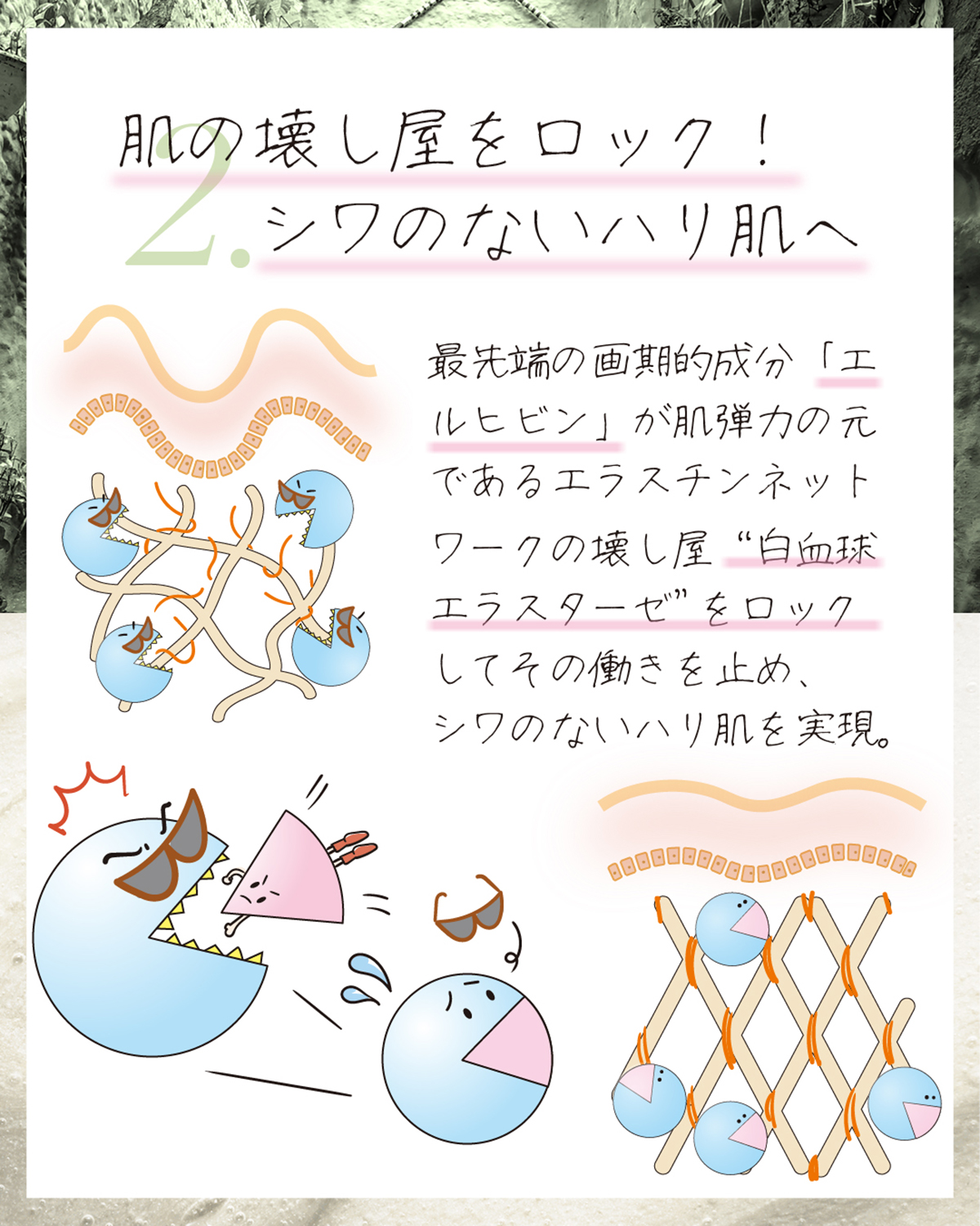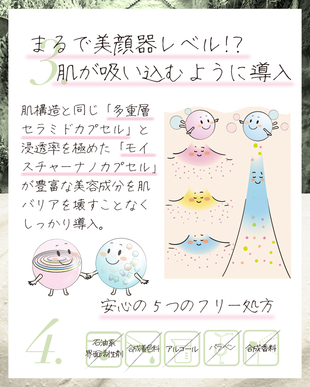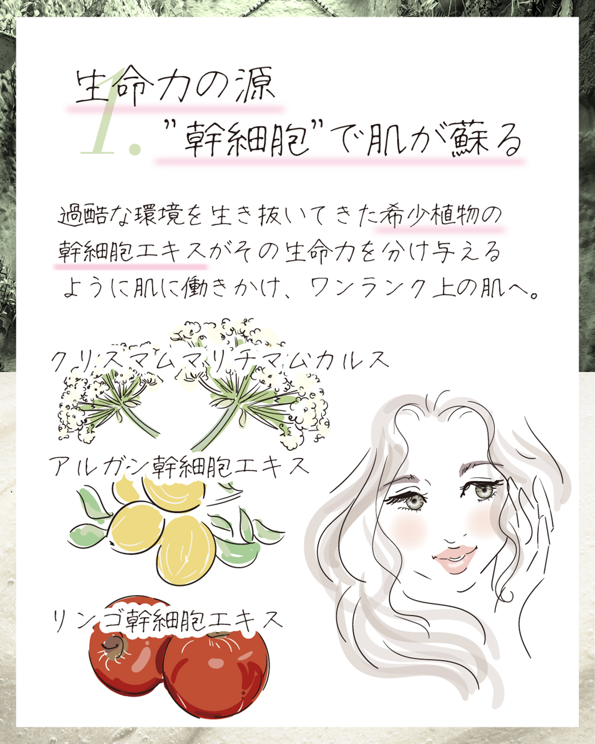 | 成分 | 水、グリセリン、BG、1,2-ヘキサンジオール、グリコシルトレハロース、パルミトイルトリペプチド-5、オリゴペプチド-24、アセチルヒアルロン酸Na、3-O-エチルアスコルビン酸、クリスマムマリチマムカルス培養液、アルガニアスピノサカルス培養エキス、リンゴ果実培養細胞エキス、ダイズタンパク、イソマルト、グリシン、ココアンホジ酢酸2Na、デキストラン硫酸Na、バリン、水添レシチン、スイゼンジノリ細胞外多糖体、フィトステロールズ、セラミド1、セラミド2、セラミド3、セラミド5、セラミド6、ナットウガム、チューベロース多糖体、アーモンドエキス、フォリオタミクロスポラ多糖体、加水分解コラーゲン、加水分解コンキオリン、ダマスクバラ花油、ポリクオタニウム-51、ポリグルタミン酸、カラスムギ穀粒エキス、(アクリル酸ブチル/イソプロピルアクリルアミド/ジメタクリル酸PEG-18)クロスポリマー、リン脂質、スフィンゴ脂質、セリン、ミリスチン酸ポリグリセリル-10、加水分解水添デンプン、レシチン、スクワラン、カルボマー、シクロヘキサシロキサン、水酸化K、PPG-4セテス-20、カラメル、キサンタンガム、メチルグルセス-10、シクロペンタシロキサン、ペンテト酸5Na、トコフェロール、ペンチレングリコール、ソルビン酸K、安息香酸Na、エチルヘキシルグリセリン、フェノキシエタノール |
