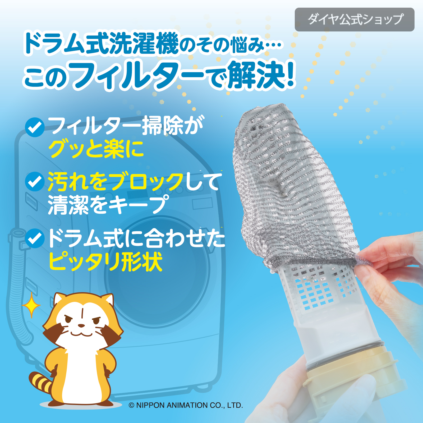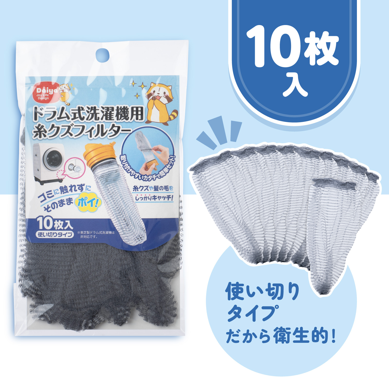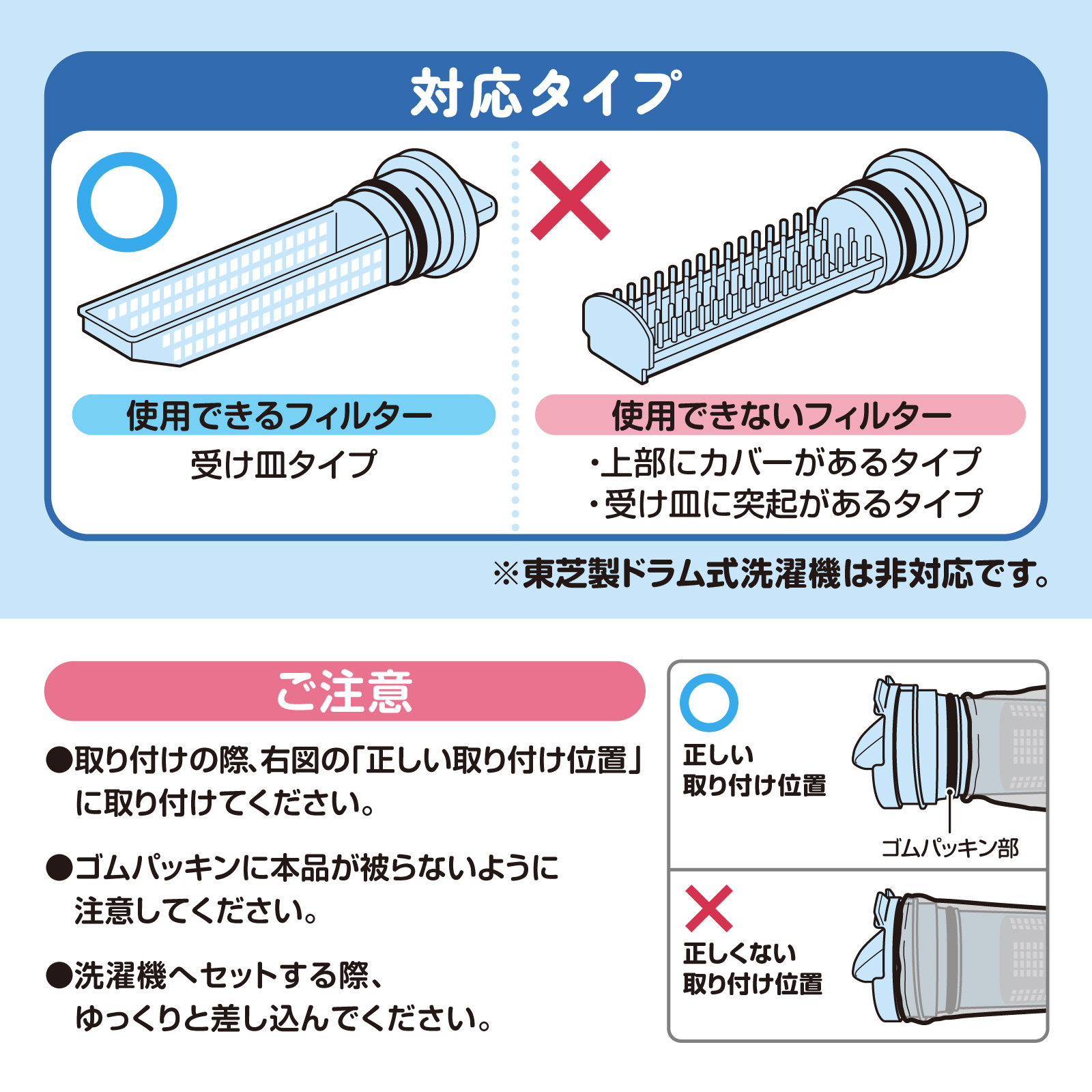 | ■ 商品特長 ドラム式洗濯機の糸くずフィルター本体に取り付けておくだけで、目の細かいメッシュ生地が糸くずや髪の毛をキャッチし、ゴミに触ることなく簡単に捨てることができます。 ●目の細かいメッシュ生地 糸くずや髪の毛をフィルターがキャッチしてくれます。 ●簡単にセット ドラム式洗濯機のフィルター本体に合う、取り付けやすいカタチなので、簡単にセットできます。 ●ゴミが目立ちにくいカラー 気持ち悪いゴミが目立ちにくいグレーのフィルターなので気分よく交換できます。 ●衛生的 使い切りタイプなので、衛生的です。 ■商品仕様 色:グレー 素材:ポリエステル、ポリウレタン 本体寸法:横約6.5cm×奥行き約0.5cm×高さ約13cm 本体質量:約0.5g ■ 注意 ・ご使用の洗濯機の取扱説明書をよく読んでお使いください。 ・使用後にゴミがたまったら、本品を取り換えてください。 ・本品を使用した後、汚れたりゴミがたまったまま継続して使用しますと、本品の目が詰まり、水漏れや洗濯機のエラーの原因になります。再利用せず、定期的な交換をお勧めします。 ・本品が汚れたまま長期間使用しないでください。カビや水垢などの原因になります。 ・洗濯機のフィルター本体のサイズによっては、交換頻度が高くなる場合があります。また、洗濯物の量や衣類の種類によっては、一回の使用で本品にゴミがたまることがあります。 ・新しいフィルターに交換しても洗濯機にエラーが表示される場合は使用をおやめください。 |