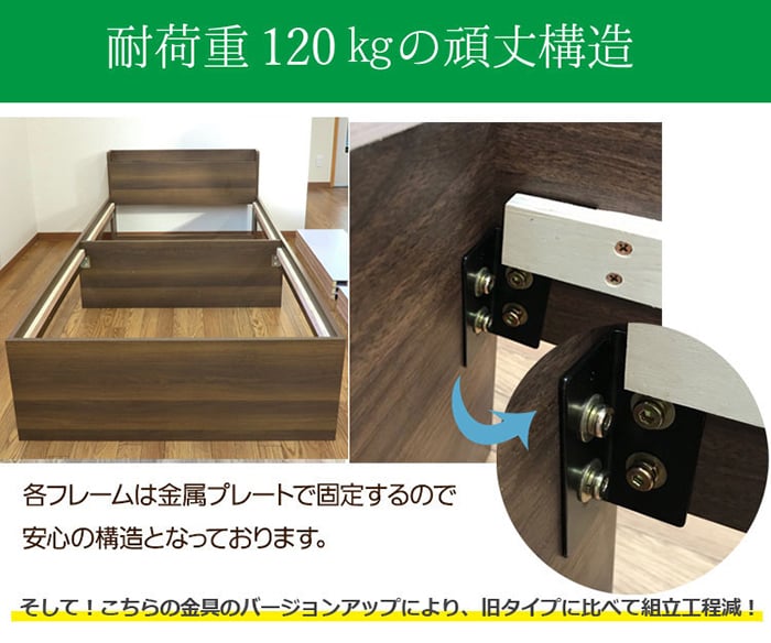 | 梱包サイズ | 梱包数:5 1.ベッドフレーム1 :約108x41x12cm・22kg 2.ベッドフレーム2 :約109x21x15cm・11kg 3.底板 :約104x40x16cm・21kg 4.引き出し収納 :約109x42x10cm・16kg 5.四ツ折り畳マットレス:約101x54x5.5cm・5kg |