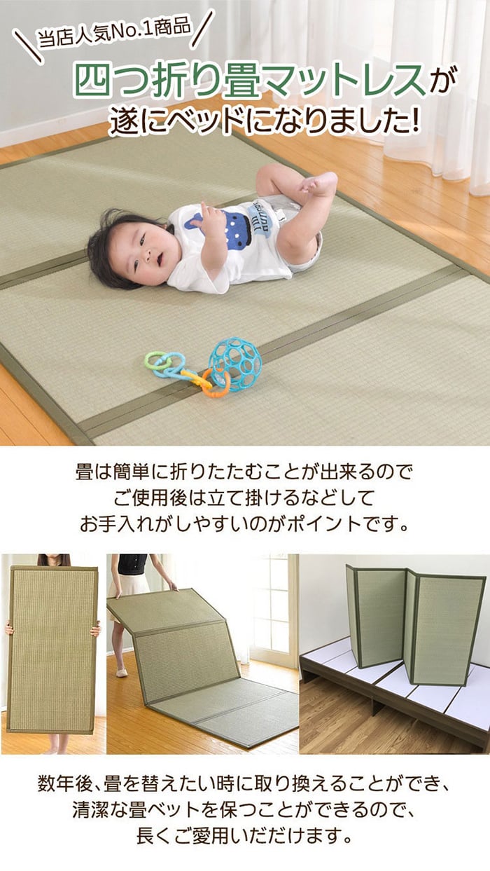 | 特徴 | 【ベットフレーム】 ●2口コンセント付 ●宮棚付き ●引き出し収納付 ●傷や水に強いメラミン化粧版 ●耐荷重:120kg ●コンパクト設計 【畳マットレス】 ●防カビ加工済み(日本製) ●抗菌防臭機能 ●コンパクト収納 |