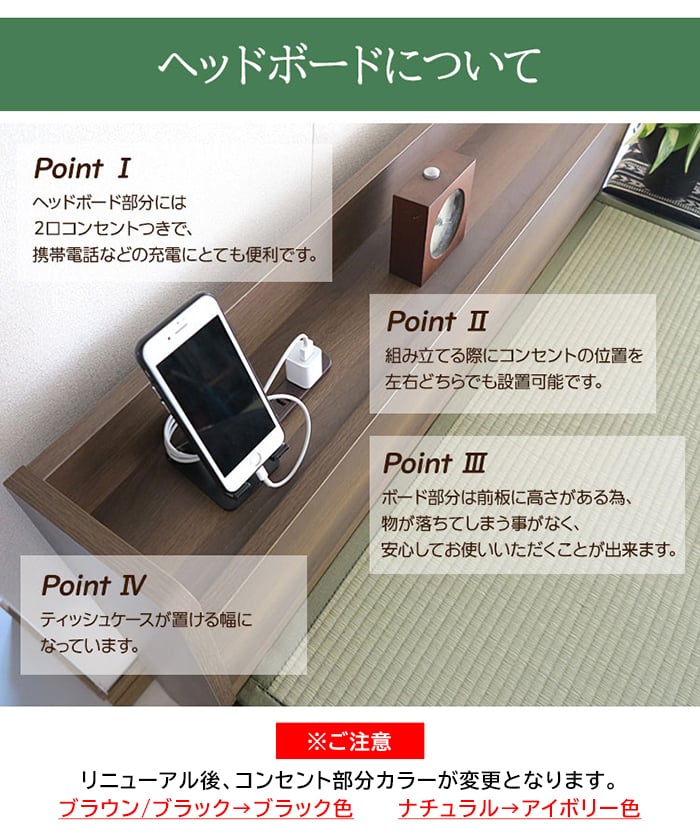 ヘッドボードはコンセント付き、組立て時にコンセントを左右どちらでも設置可能です。