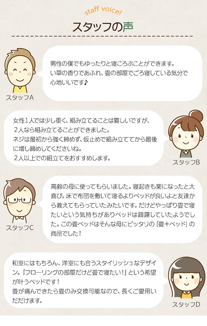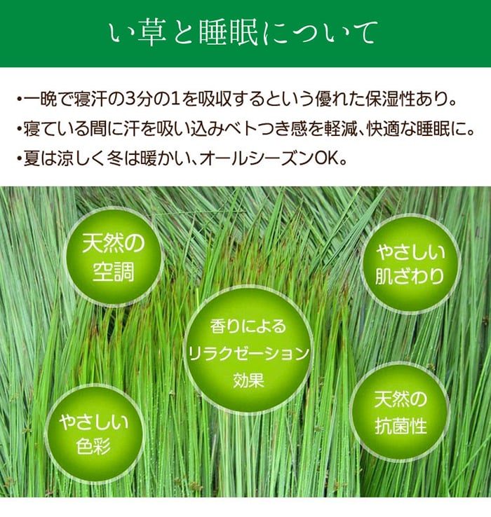 | ご注意事項 | ・お使いのブラウザ・モニター等の環境により、実際の商品と多少色が異なって見える場合がございます。 その際は何卒ご容赦下さいますようお願い申し上げます。また、天然素材を使用している商品につきましてはサイズに多少の誤差が生じる場合がございます。 ・配送は全て玄関先でのお渡しとなります。配送員による室内への搬入・組立てはお受けできかねます。 ・ご購入前に商品が階段や廊下を通ることが可能かをご確認ください。 ・ベッドフレームについて お客様組立て品となります。プラスドライバーをご用意ください。 2人以上での組立てをおすすめします。 商品組み立て開始前に部品不足、破損がないか必ずご確認ください。 ネジは最初から強く締めず、仮止めで組み立ててから最後に増し締めしてください。 ・四ツ折りマットレスについて い草の根に近い白っぽい部分の事を根白と言います。い草は先端と根に近い方、中央部分と色が違って見えることがあります。これはい草製品の特性で、不良ではございません。 ・ご使用の前には、乾いた雑巾で、織り目にそって軽く乾拭きをして下さい。 表面のホコリや、余分な染土(人体に害のない成分です)が取れ、い草にツヤが増します。 強くこすったり、水拭きすると、変色やカビの原因になる恐れがあります。また、夏場に部屋を閉め切ると、ダニなどが発生しやすくなります。時々、窓を開けて喚起してください。 ※品質には細心の注意をはらい検査をおこなっておりますが、天然素材を使用しているため、使用状況や使用場所など環境によってはカビ等が発生する場合がございます。 ご使用の際には定期的に空気の入れ替えや、風通しのよい場所で日陰干しをし、十分湿気をとってお使い下さいますよう、お願い申し上げます。 ※製品の上に布団を敷いた状態で使い続けた場合、寝汗などの水分によりカビが発生することがあります。必ず1日おきに、製品を立てて完全に乾燥させてからご使用下さい。 |