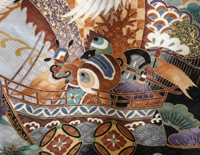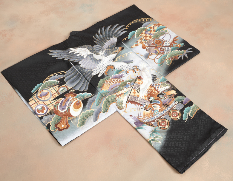 鷹を中心に宝船や軍配、小槌、飛翔鶴などの縁起柄が賑やかに御着物を彩ります!!