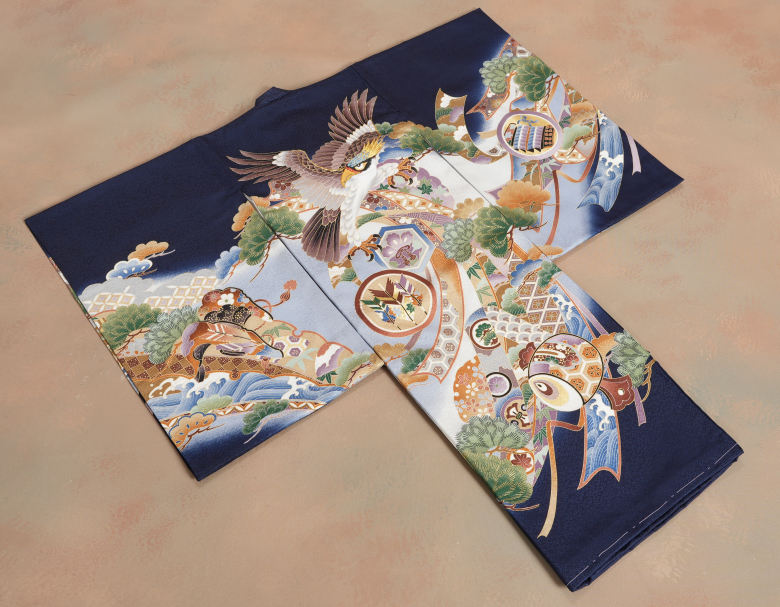 鷹を中心に松竹梅、熨斗、七宝、青海波などの古典縁起柄が御着物全体を彩ります!!