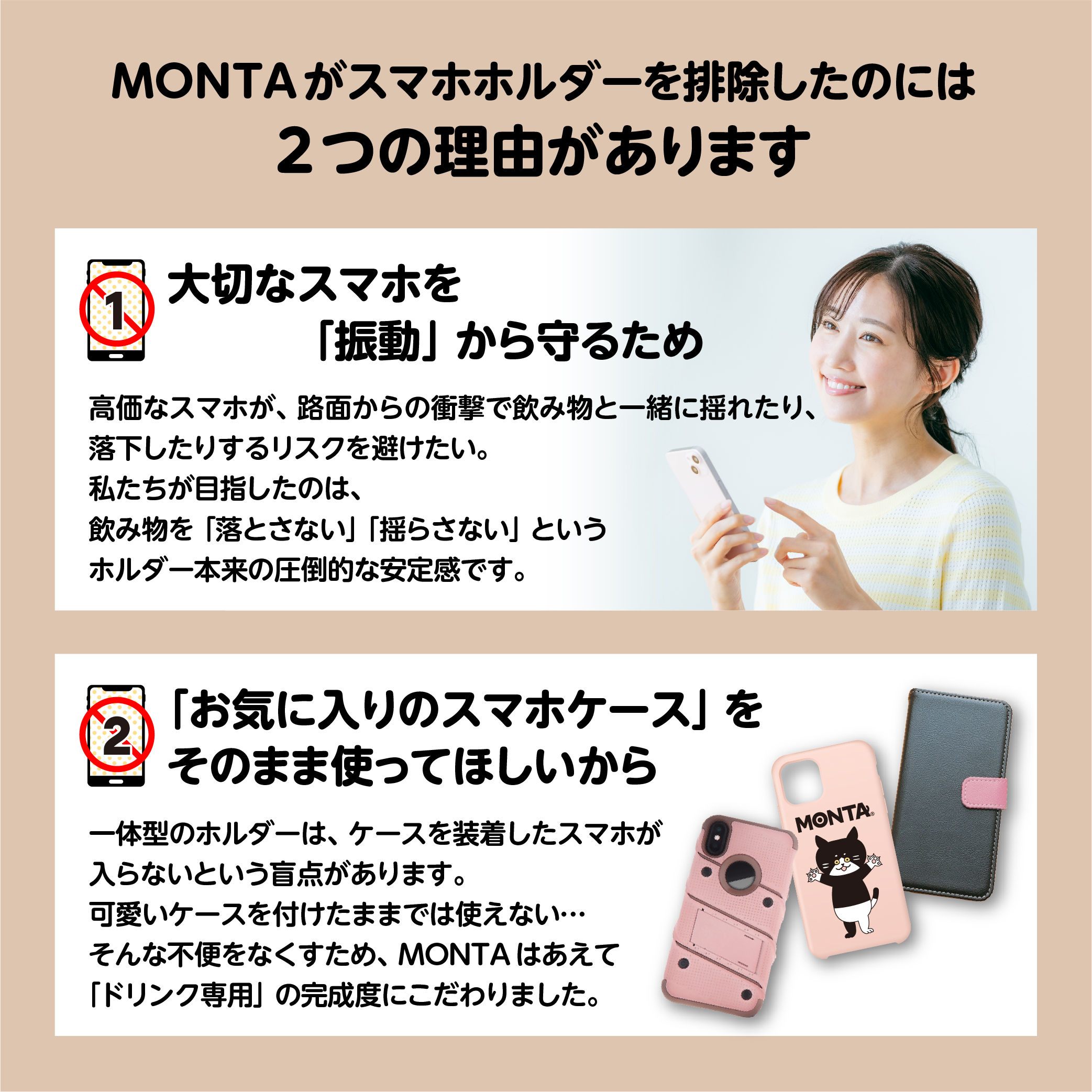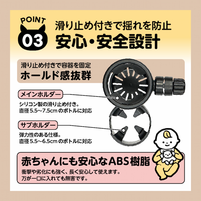 ・滑り止めで落下防止:メインホルダーにはシリコン製の滑り止めを、サブホルダーには弾力のある突起を採用し、走行中のガタつきや飲みこぼしを徹底的に防ぎます。