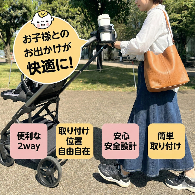 ・ダブル収納システム:メインとサブ、2つのホルダーで、ママのコーヒーと赤ちゃんの哺乳瓶を同時に持ち運べます。