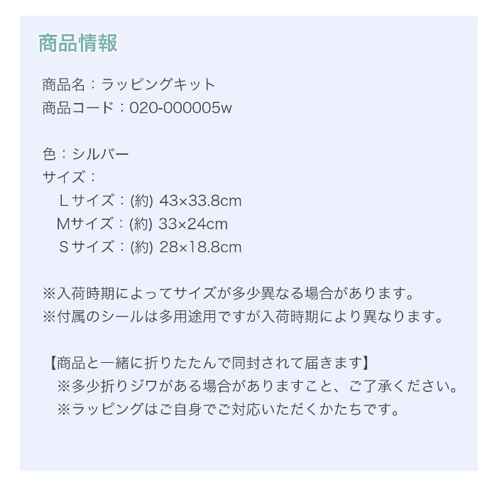 <h1>ラッピングキット シルバー (Sサイズ・Mサイズ・Lサイズ)</h1> |