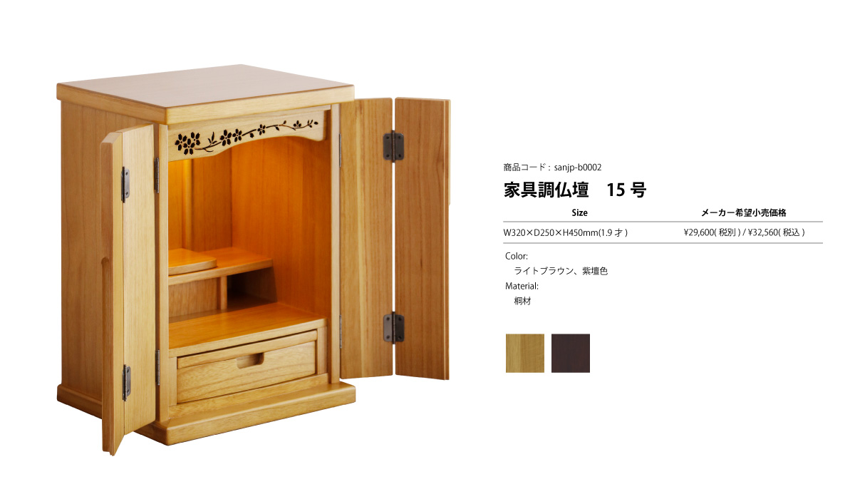 | 特徴 | ・完成品 ・輸入品 ・本尊台付き ・膳引き付き(ストッパーなし) ・引き出し付き ・LEDダウンライト付き |