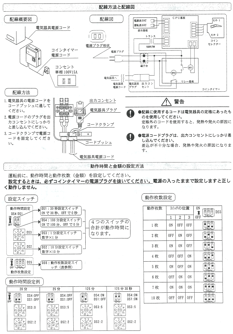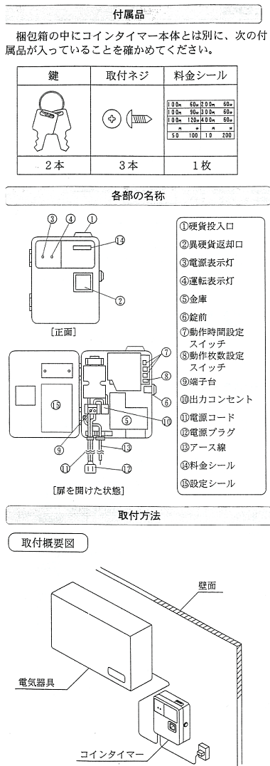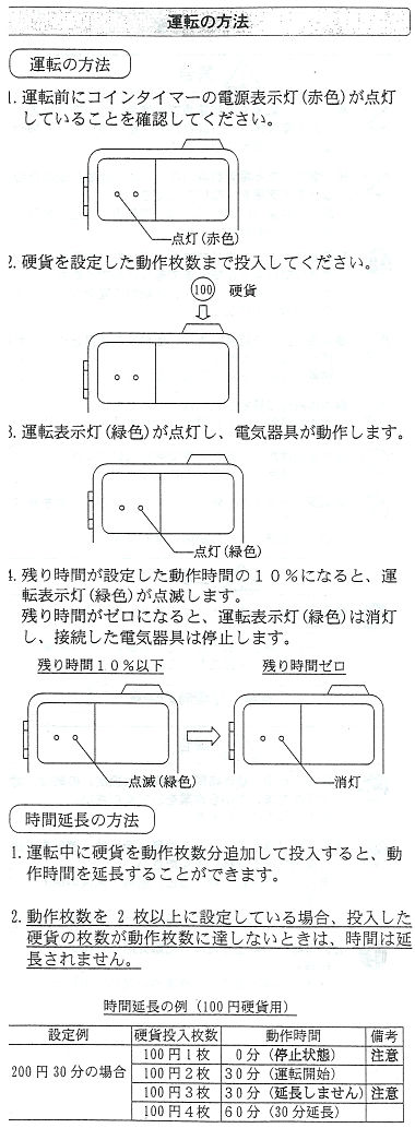 応用範囲の広いタイマーです。 ★TD−AD(高容量型電子式コインタイマー) ○主な用途 ヘアドライヤー・エアコン・スポットクーラー など ●大容量を開閉します 最大15Aまでコントロールできます。(外付電磁接触器不要) ●業界最小サイズ W170×H220×D70mm 約2.0kg ●異貨幣返却機能付 不正硬貨投入間違いのトラブルを防ぎます。 ●容易な時間設定 ロータリースイッチを採用し最短30秒から時間設定ができます。 ※TD-AD-100は廃止となり後継機種がTD-AD-100Hとなります。 ![]()