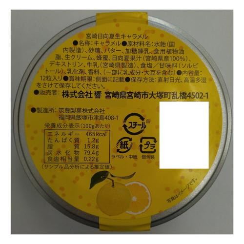 | 原材料 | 名称:キャラメル 水飴(国内製造)、砂糖、バター、加糖練乳、食用植物油脂、生クリーム、蜂蜜、日向夏果汁(宮崎県産100%)、デキストリン、牛乳(宮崎県製造)、食塩 甘味料(ソルビトール)、乳化剤、香料、(一部に乳成分・大豆を含む) |