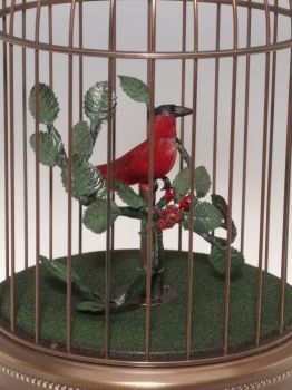 ケージの中の小さな鳥が本物そっくりなさえずりを聴かせてくれます。