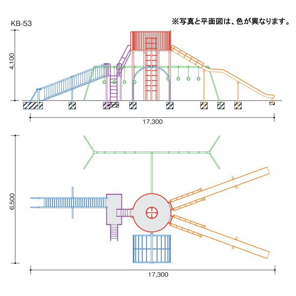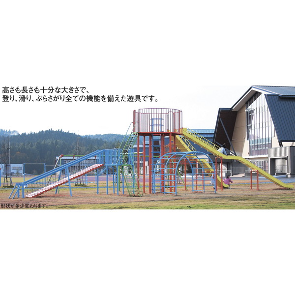 | ●寸法/全長17.3m×全幅6.5m×全高4.1m ●無鉛塗装 ●※形状が多少変わります。 ●本製品は、「遊具の安全に関する規準」JPFA-SP-S:2024に準拠しています。 ●本製品の鋼材、鋼管は亜鉛メッキ材使用。 ●※別途基礎工事が必要となる場合がございます。 | |
