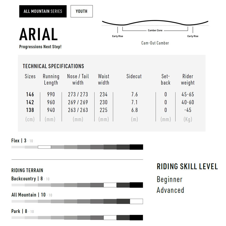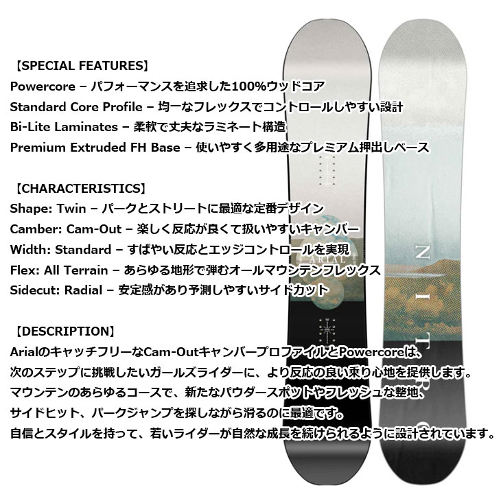 | ARIAL 【SPECIAL FEATURES】 Powercore - パフォーマンスを追求した100%ウッドコア Standard Core Profile - 均一なフレックスでコントロールしやすい設計 Bi-Lite Laminates - 柔軟で丈夫なラミネート構造 Premium Extruded FH Base - 使いやすく多用途なプレミアム押出しベース 【CHARACTERISTICS】 Shape: Twin - パークとストリートに最適な定番デザイン Camber: Cam-Out - 楽しく反応が良くて扱いやすいキャンバー Width: Standard - すばやい反応とエッジコントロールを実現 Flex: All Terrain - あらゆる地形で弾むオールマウンテンフレックス Sidecut: Radial - 安定感があり予測しやすいサイドカット 【DESCRIPTION】 ArialのキャッチフリーなCam-OutキャンバープロファイルとPowercoreは、次のステップに挑戦したいガールズライダーに、より反応の良い乗り心地を提供します。 マウンテンのあらゆるコースで、新たなパウダースポットやフレッシュな整地、サイドヒット、パークジャンプを探しながら滑るのに最適です。 自信とスタイルを持って、若いライダーが自然な成長を続けられるように設計されています。 ●取り付けやチューンナップ時に性能に問題ない多少の汚れや擦れが生じる場合がございますが、ご了承お願いいたします。 ●ご注文可能でも欠品の場合もございます。(複数店舗在庫共有のため)その際はキャンセルさせていただきます。 ●商品画像について:撮影環境やモニターにより実物とカラーの見え方や色味が異なる場合がございます。 |