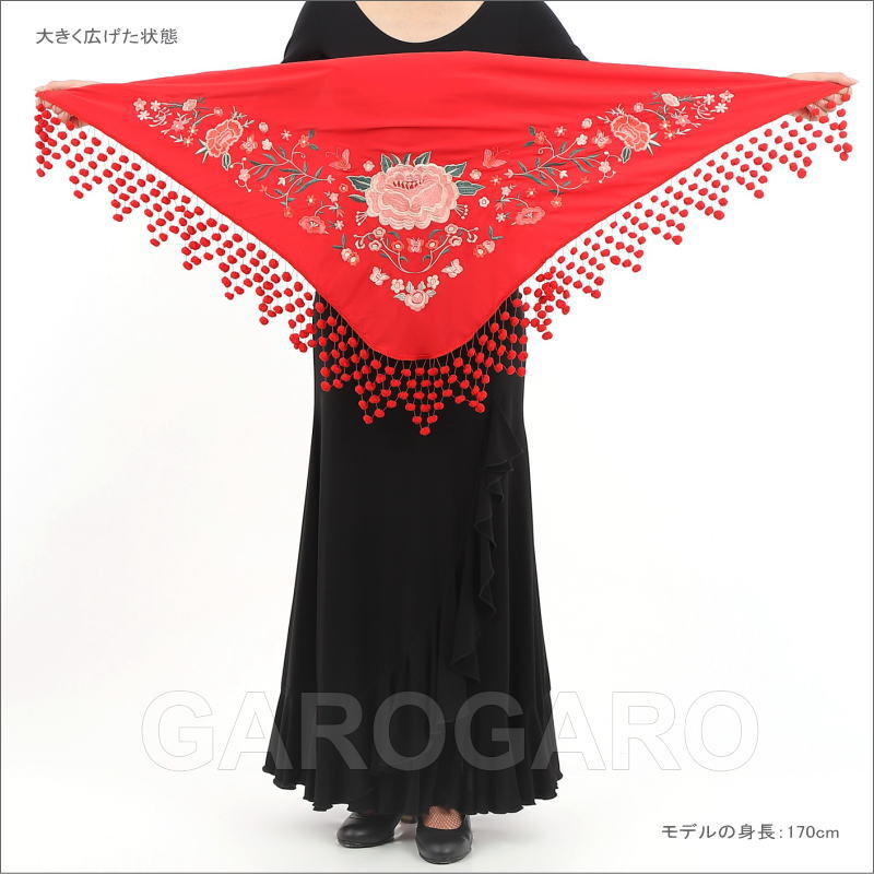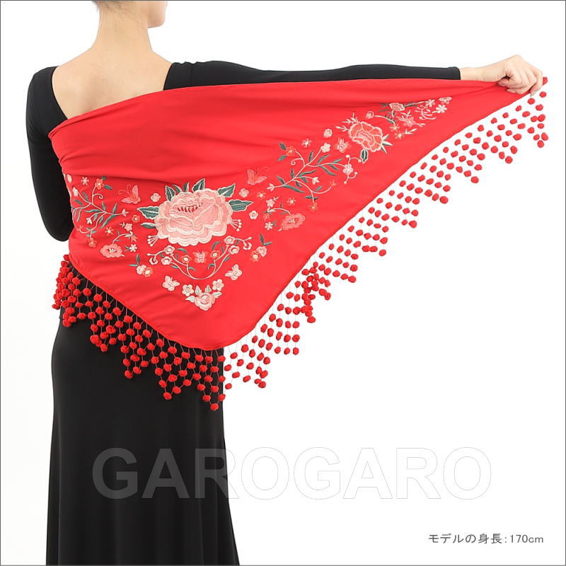 おすすめポイント: 中央に大きなバラの花の刺繍を施した、伝統的なデザインの豪華なマントンシージョ(三角形のショール)です。 スペインの民族衣装に使われる「マドローニョ」と呼ばれるポンポン飾りがポップな印象のショール。アレグリアスやガロティンなど、明るい曲調の曲に合いそうですね。 機械刺繍です。 --- 素材: 主にポリエステル サイズ(cm): 【長さ(首側の一番長い辺)】 約140cm 【縦の長さ (長辺から頂点まで)】60cm 【マドローニョ(ポンポン)幅】 最大値が約12cm (掲載のサイズは製品の実測値です。多少の個体差がありますがご容赦ください。) |