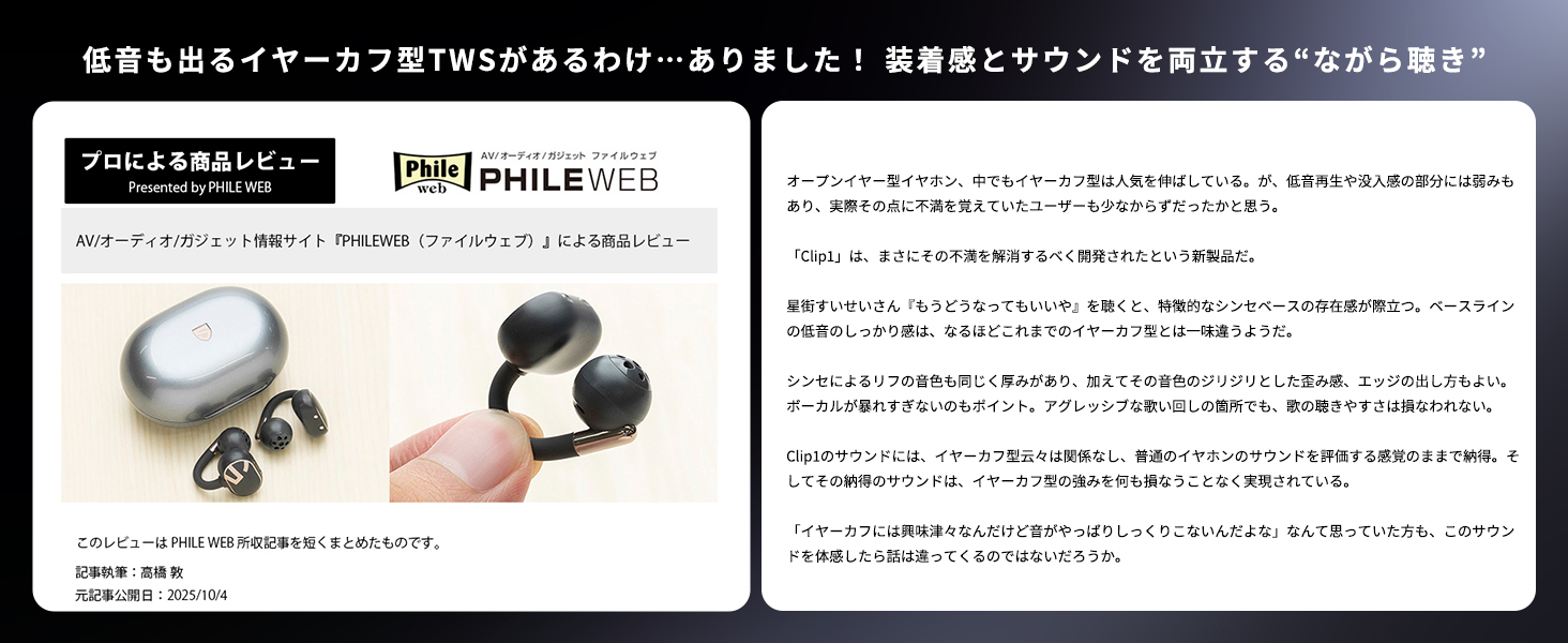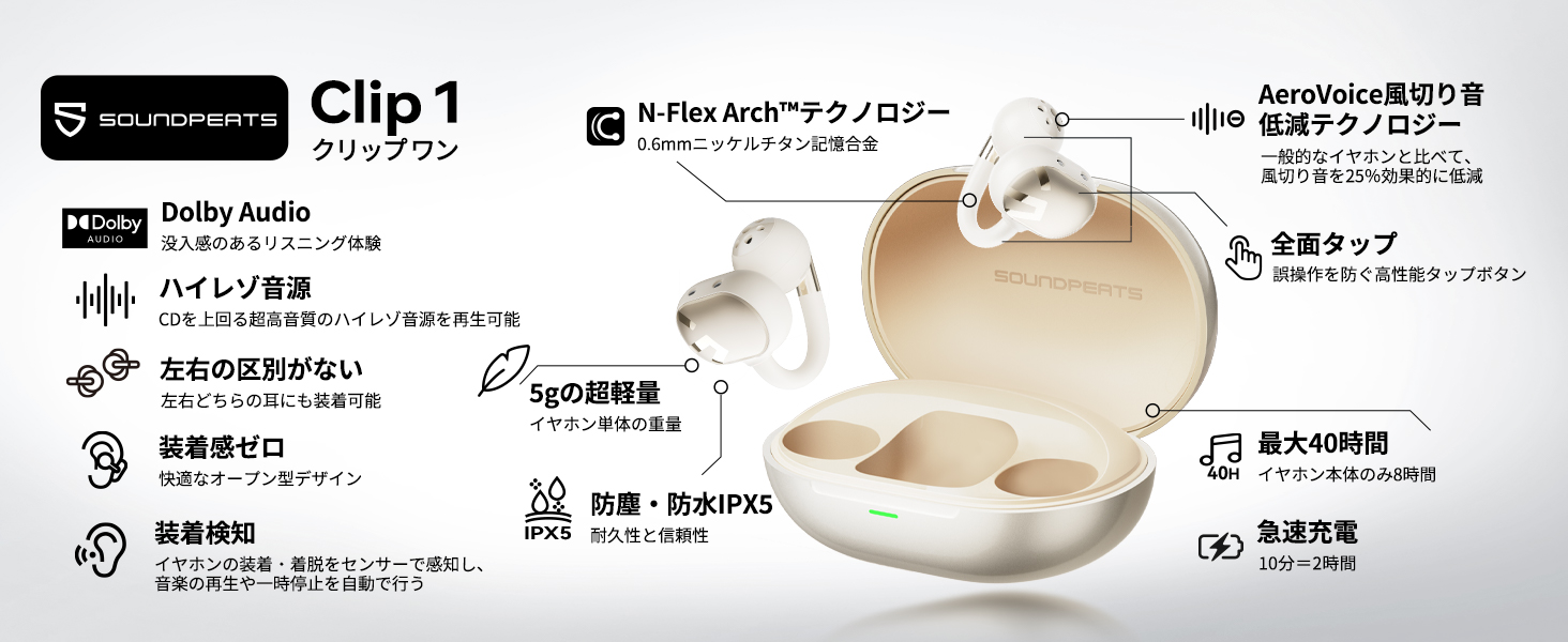 【Dolby Audio × 12mmデュアルドライバー】映画館のような没入感をご自宅で、SOUNDPEATS初のDolby Audio対応モデル。臨場感あふれる立体サウンドが、映画やライブ音源を圧倒的に引き立てます。新開発12mmデュアルマグネットドライバーが、迫力ある低音とクリアな高音を実現。まるでその場にいるような音の広がりをご体感ください。※Dolby Audioは専用アプリ「PeatsAudio」で有効化できます。 【圧迫感ゼロ!“着けていることを忘れる”新次元の装着感】耳を塞がないオープンイヤーデザインだから、音楽を楽しみながらも車の音・駅のアナウンス・お子様の声などを自然にキャッチ。肌に優しい液体シリコンと、わずか0.6mmの超薄型ニッケルチタン合金を使用した「N-Flex Arch構造」が、どんな耳にも柔らかくフィットします。片耳わずか5gの超軽量設計&人間工学デザインで、長時間でも驚くほど快適。眼鏡・マスク・ヘルメットとも干渉せず、仕事からスポーツまでストレスフリーです。 【ハイレゾ × LDAC対応 ― 耳元で広がる未来の音】CDを超える最大96kHz/24bitのハイレゾ音源再生に対応。オープンイヤーながら、細部までクリアなサウンドを実現します。「Hi-Res Wireless」認証を取得済み。独自の「Dynamic EQ Pro」が楽曲ごとに音域を最適化し、伸びやかで透明感ある音を再現。音楽好きも納得の、次世代リスニング体験をお届けします。【毎日をスマートに変える「AutoSense」】独自の左右自動識別テクノロジーで、装着した耳を瞬時に検出。左右を自動で切り替えるから操作不要。さらに着脱センサーで音楽の再生/一時停止を自動化。アプリでは「マルチポイント接続」「落下検知」「低遅延ゲームモード」など、ライフスタイルを快適にする機能が満載です。 【最大40時間再生&急速充電】イヤホン単体で最大8時間、ケース併用で最大40時間のロングバッテリー。 通勤・通学・リモート会議・長時間の外出でも、バッテリー切れの心配はありません。 さらに10分充電で約2時間使える急速充電にも対応。思い立ったらすぐに音楽を楽しめます。 【独自の音漏れ防止&風切り音低減】「SoundFocus」構造で音を鼓膜にダイレクトに届け、音漏れを効果的に抑制。周囲に迷惑をかけず、プライバシーも守れます。 さらに特許出願中の「AeroVoice」テクノロジーにより、一般的なイヤホンより風切り音を25%カット(自社測定値)。屋外でもクリアな通話が可能です。