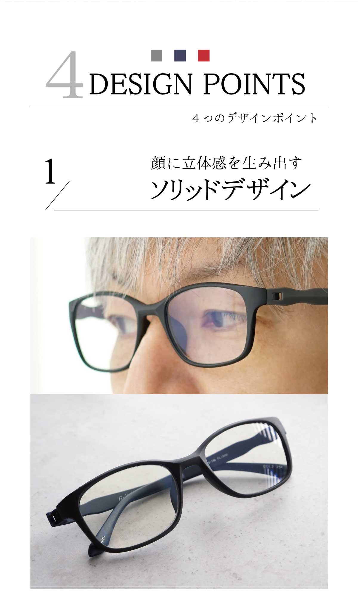 フレーム全体にエッジを効かせたシャープなデザイン。光と影の陰影が、顔に立体感を生み出します。掛けるだけで表情が引き締まり、シンプルでありながら洗練された印象を演出します。