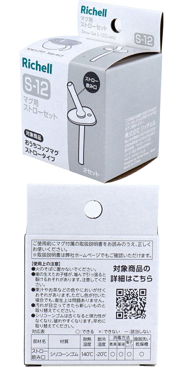 商品 | リッチェル マグ用ストローセット S-12 | サイズ | 約65×90×53mm | 重量 | 約20g | 材質 | シリコーンゴム | 仕様 | セット内容:マグ用ストロー 2個入 ・食器洗い乾燥機OK ・煮沸・薬液消毒OK ・電子レンジ消毒OK ・耐熱温度/耐冷温度:140度/-20度 対象商品:おうちコップマグストロータイプ | 生産国 | 中国 | 販売元 | 株式会社リッチェル | 広告文責 | 株式会社ルーマニア/03-5876-8031 | |