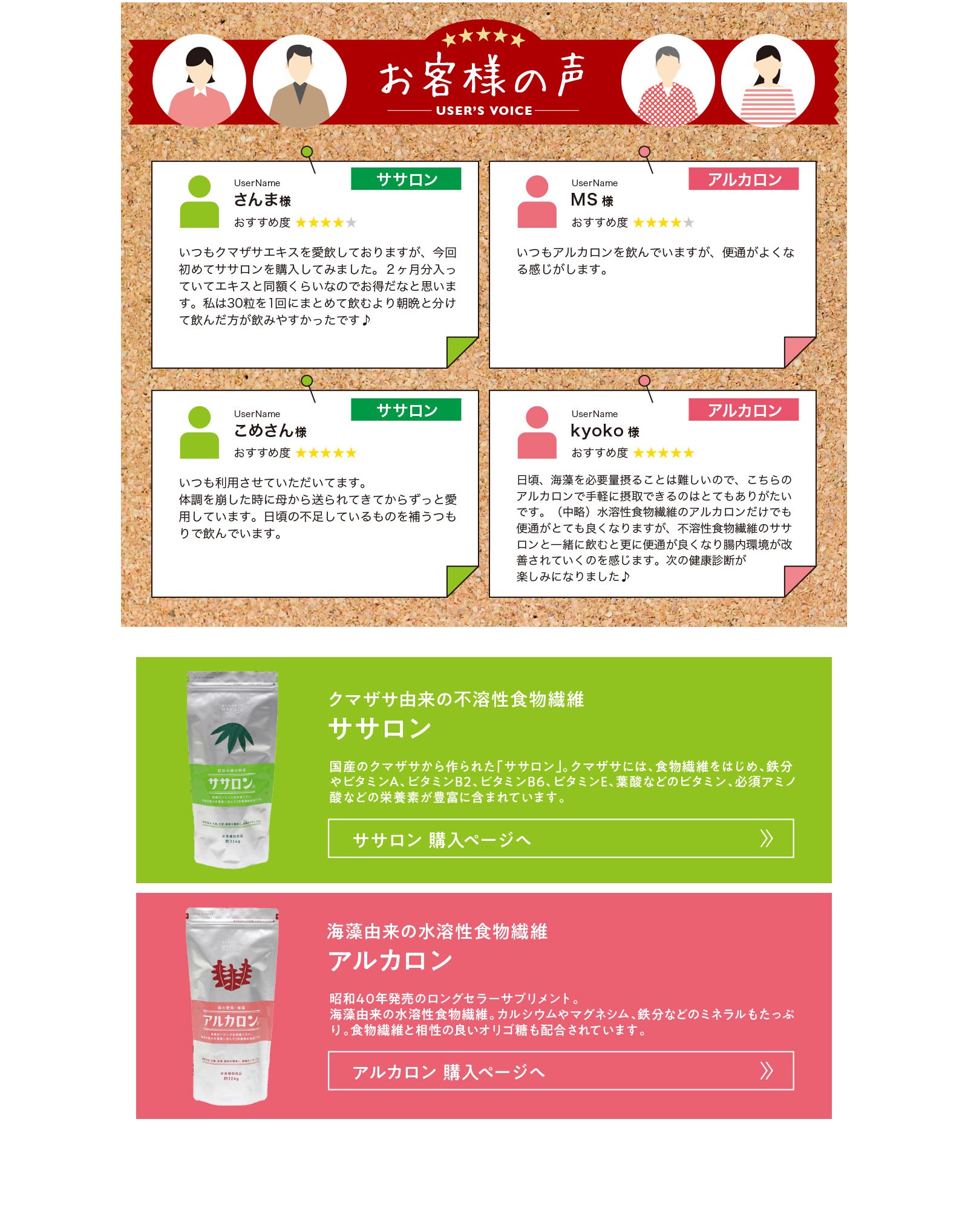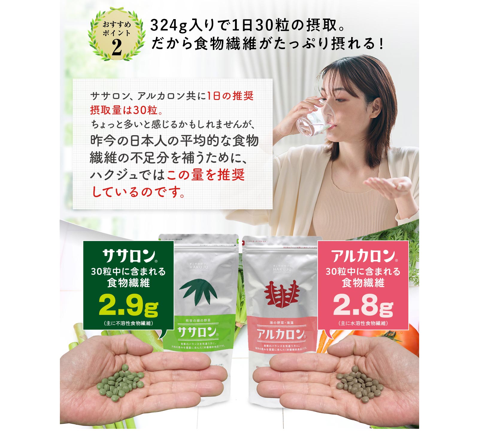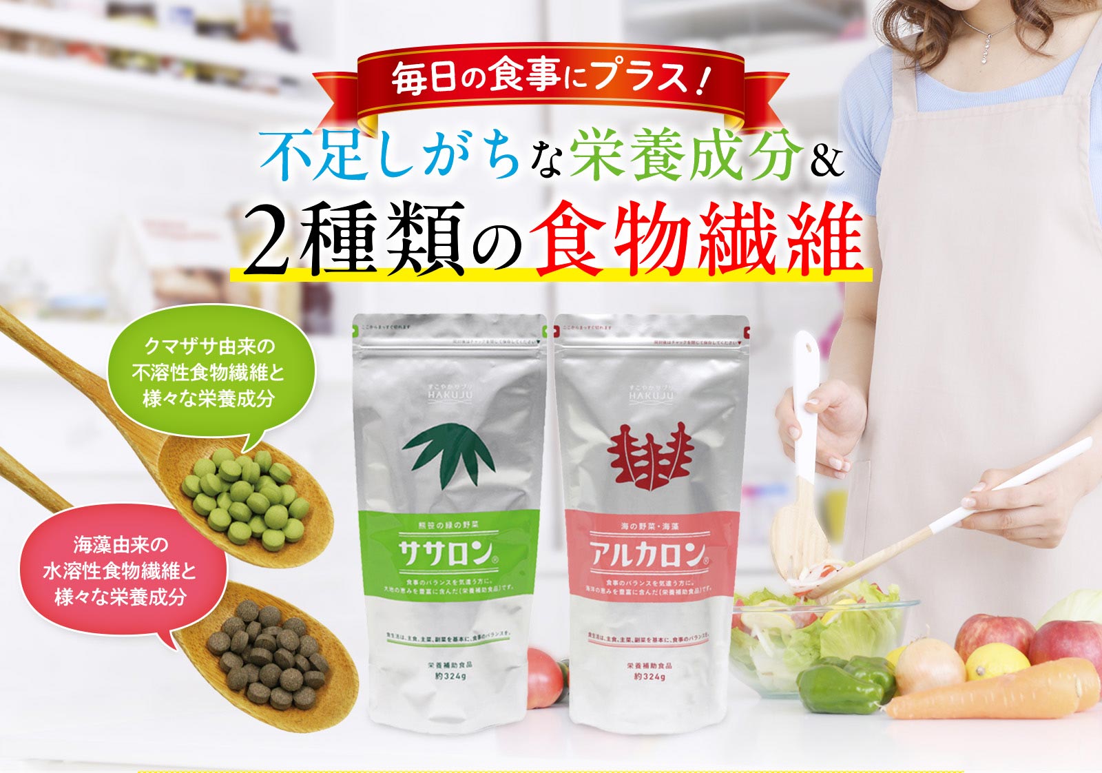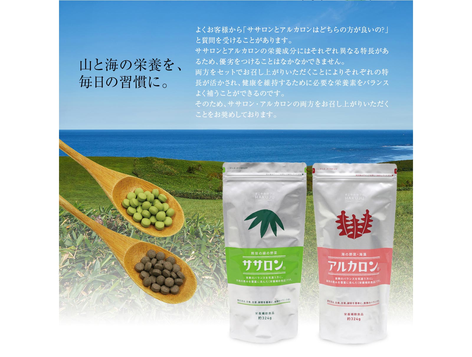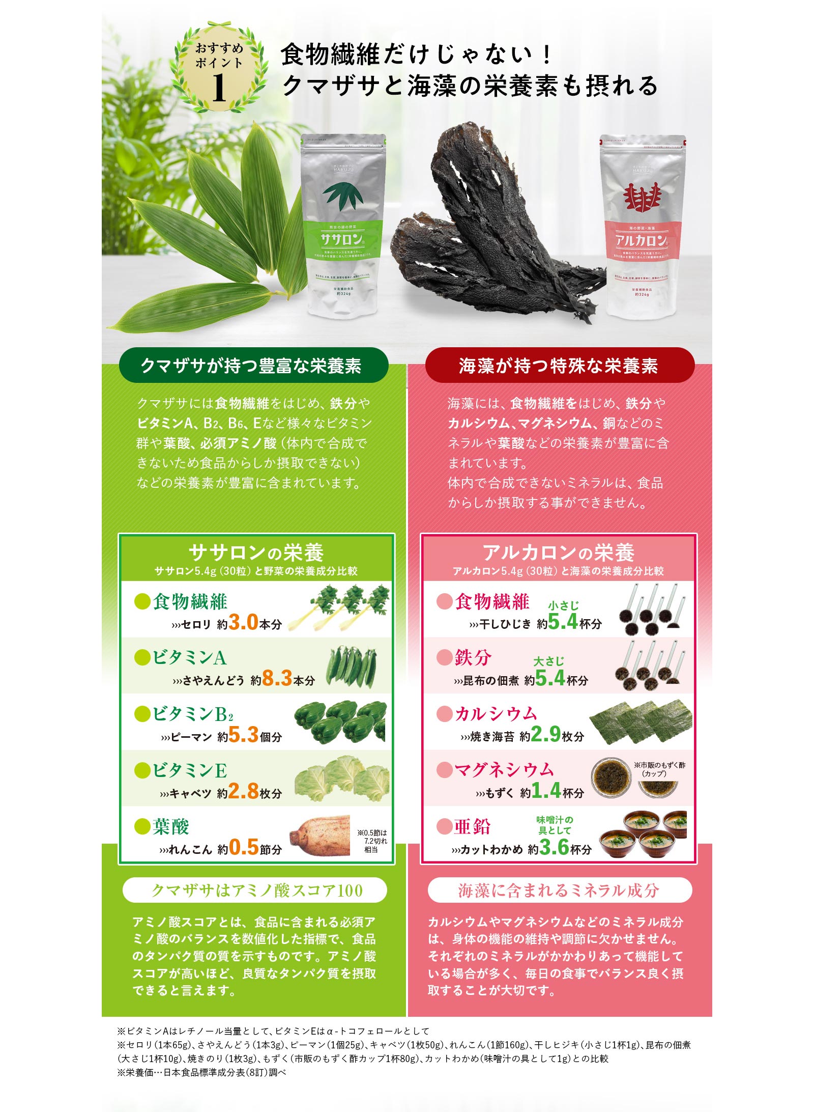 不溶性(非水溶性)食物繊維を中心に、現代人が特に不足しがちなカルシウムや必須アミノ酸、緑の濃い食物特有の葉緑素(クロロフィル)など、健康に必要な栄養成分を豊富にバランス良く含んでいるのがクマザサ。白寿では、北海道の大雪山系のクマザサを原料としています。