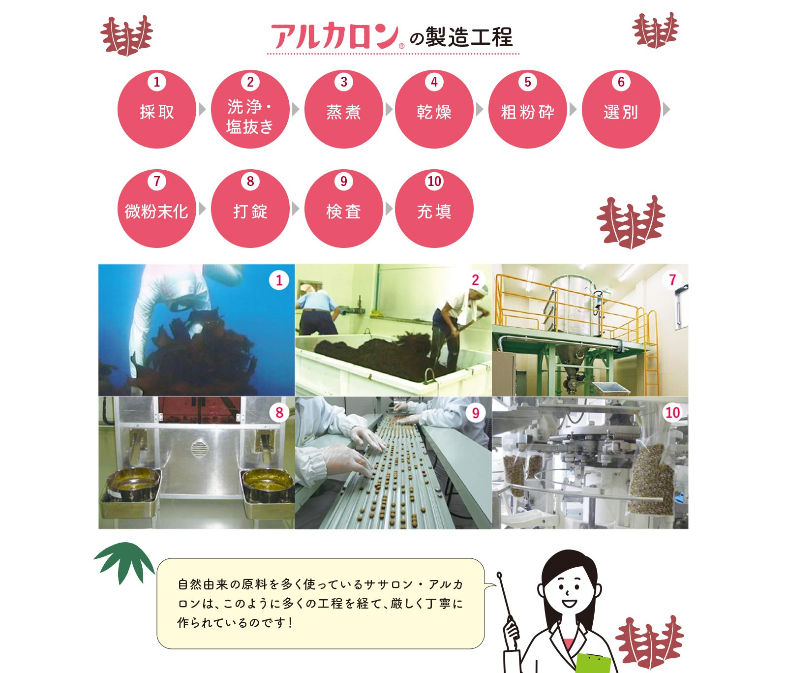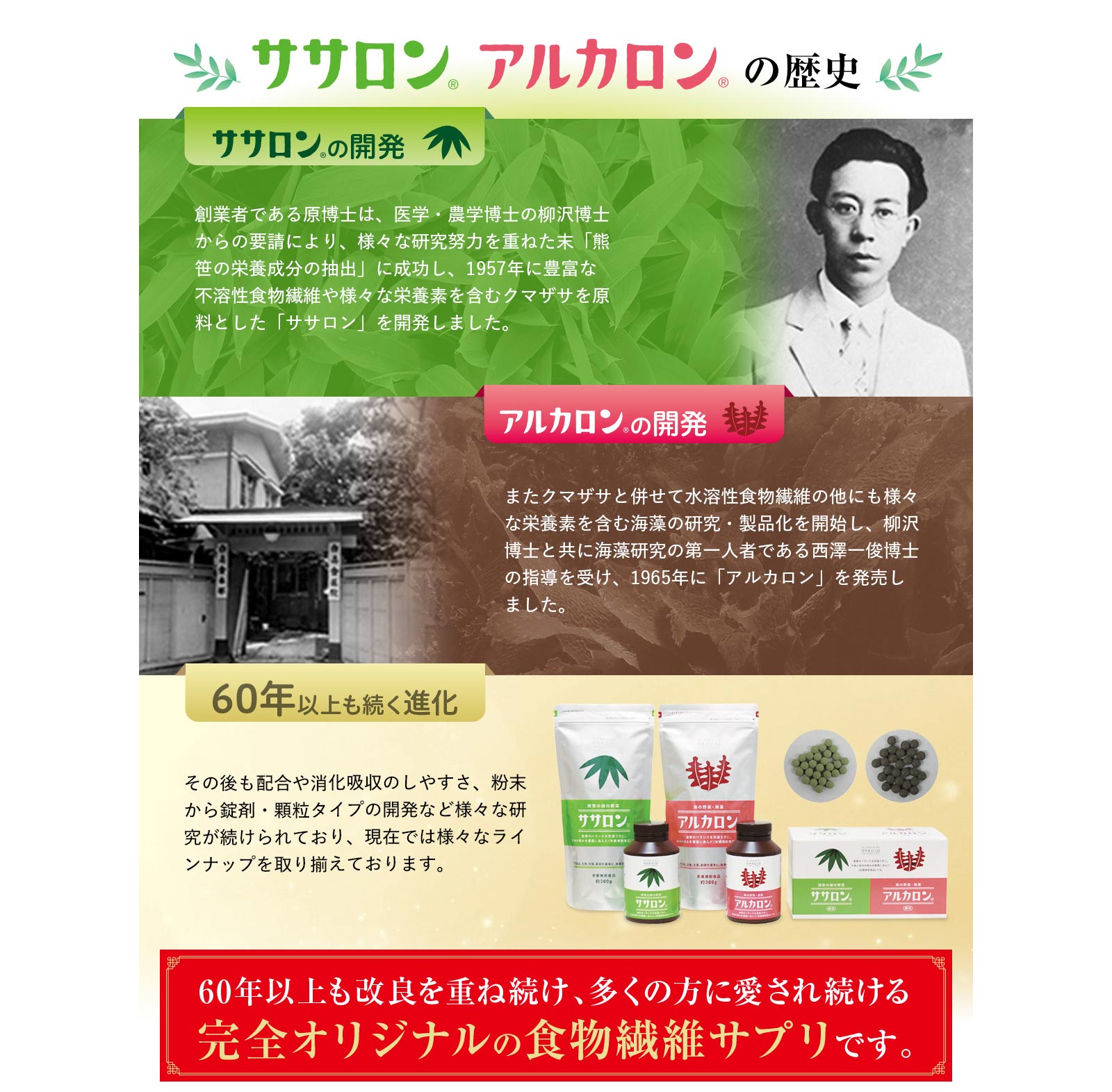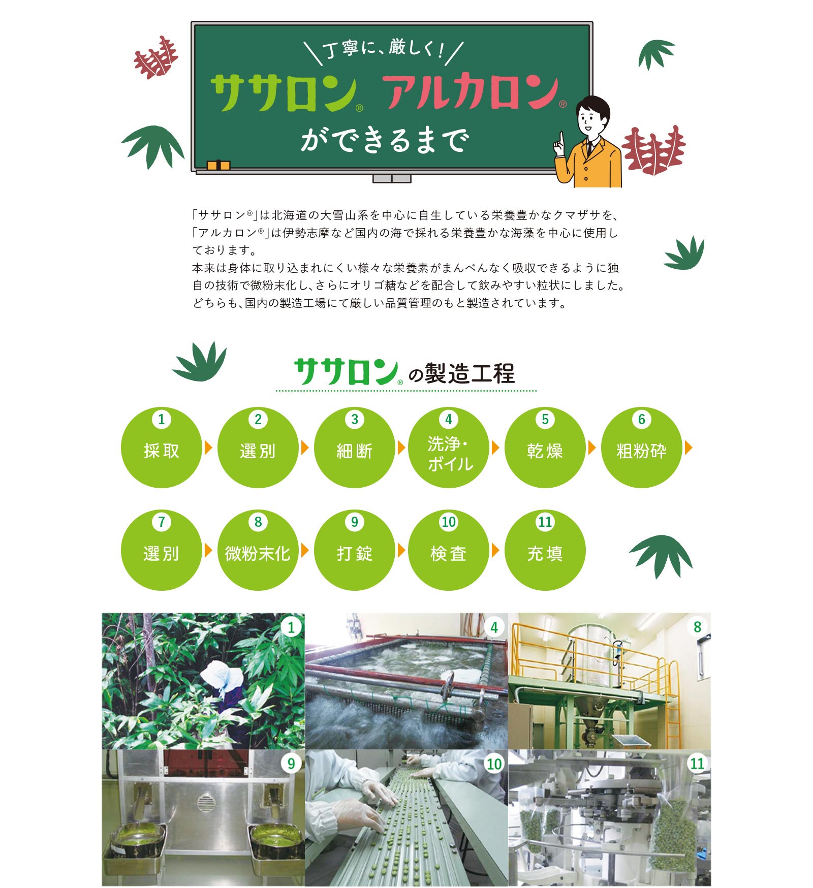 しかし、クマザサは、細胞壁の固い植物で、そのままでは栄養素が吸収されないという特徴を持っていました。せっかくの栄養素を壊さないような加工方法はないかと研究を重ねた結果、たどりついたのが独自の微細粉末化技術。「ササロン」には、太陽と大地の新鮮な恵みが、ぎゅっと詰まっています。