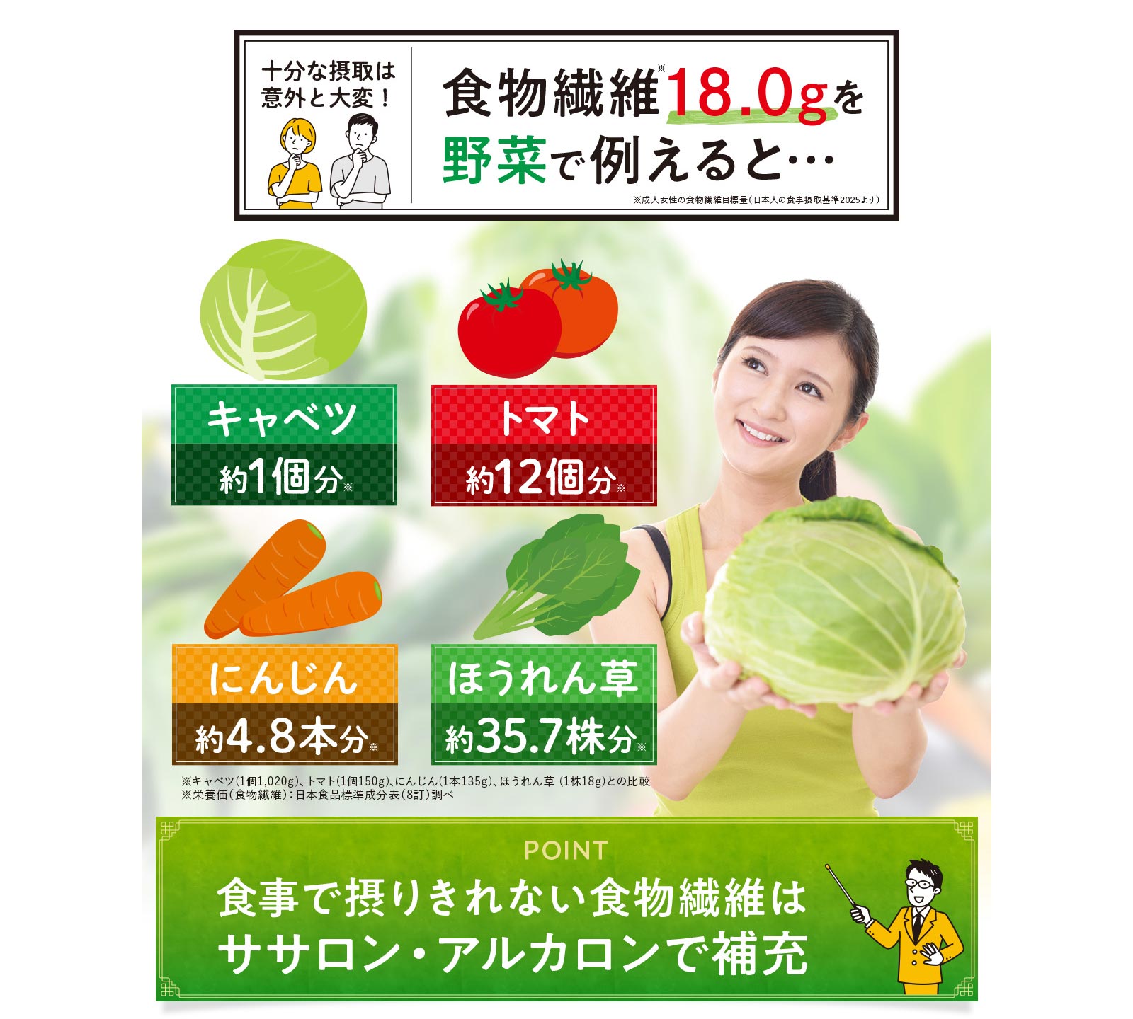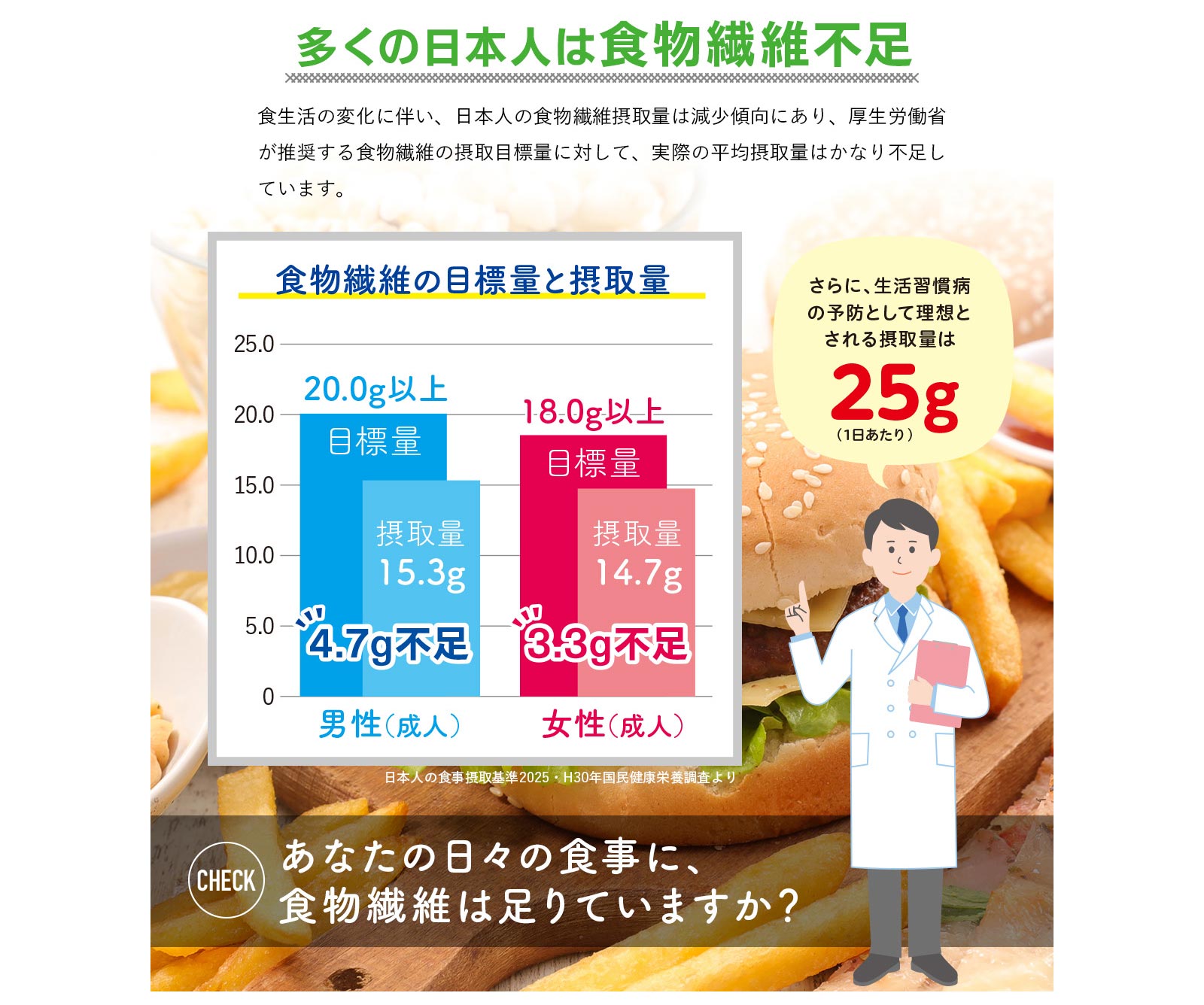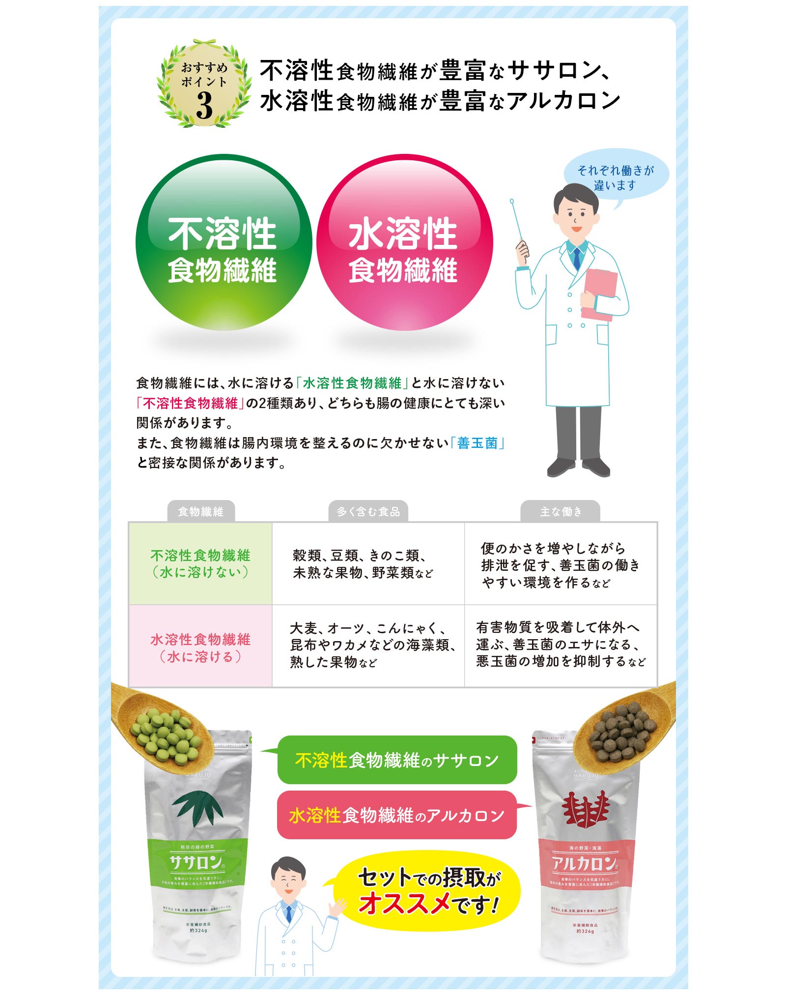「食物繊維」には水溶性のものと不溶性のものがあり、それぞれの働きが違うため、その両方を摂ることが大切です。