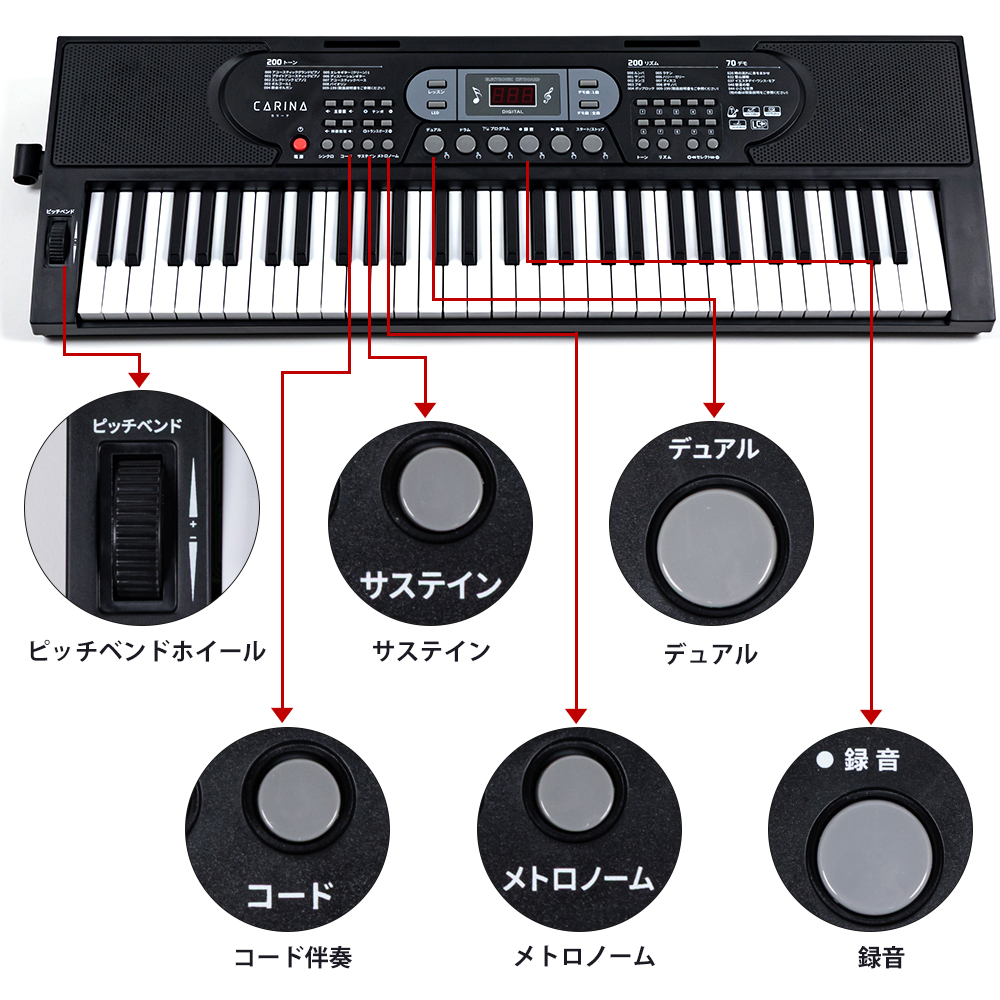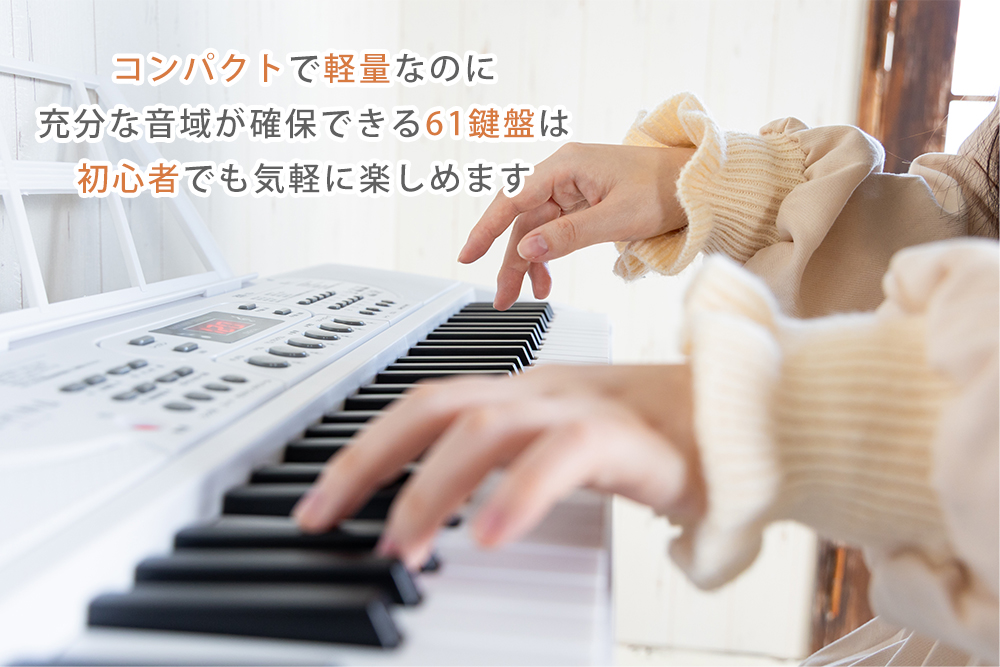 | 特長 | 気軽に演奏を楽しめる、多機能な電子キーボード 61鍵盤で十分な音域を確保しており、練習や趣味として気軽に演奏を楽しめます。 操作が不慣れな方でも分かりやすい高品質のLCD液晶画面と日本語パネルを備え、豊富な音色とリズム、音質の優れたスピーカーで練習用として家族や友達と一緒に音楽を楽しむこともできます。 【機能】200種類音色・200種類リズム・60曲デモ曲、録音・再生機能、移調、シンクロ機能、コード伴奏機能、サスティン、メトロノーム、レッスン機能、デュアル鍵盤、ドラムキッド、光る鍵盤、音量調節、テンポ調節、ピッチベンドホイール、同時発音数8音 楽しく練習できる2種類の練習モード 2種類の演奏練習モード搭載。 ご自身のレベルに合わせたモードで 楽しみながら演奏の練習ができます。 【2通り給電可能対応】USB給電:付属のアダプターとUSBケーブルを使用して、コンセントがあればすぐに使用できる。 乾電池駆動:移動先に電源が無くても演奏ができます。1.5 V 単三電池x4本(別売り) ※USB給電と乾電池を両方同時に使用することはできません。 乾電池がセットされた状態では、USB給電すると電源が入らなくなります。USB給電を使用する場合は、電池を取り出す必要があります。 ※音質、鍵盤タッチなどの感じ方は個人差ございます。 | |||||