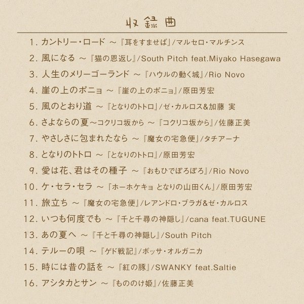 涼しげな木陰で午後のひと休みに味わいたいのは、挽きたてのコーヒーと軽快なボサノバのメロディ…。そんな雰囲気をお家で楽しめる「午後のボッサ」第三弾は、誰もが心あたたまるジブリ・ソング集!ゼ・カルロス(g)、佐藤正美(g)、ボッサ・オルガニカ(渡辺幹男+吉田和雄)、原田芳宏(steel pan)ほか熟練ミュージシャンが奏でるインストカヴァー曲に、エアリーな女性ヴォーカル曲を交えた、オトナのジブリ・ワールドを満喫できる一枚。シンプルでソフトタッチのアレンジは、午後のブランチにはもちろん、家族でお食事などのBGMとしてもぴったり!あなたのまわりに、爽やかな風が吹きます。