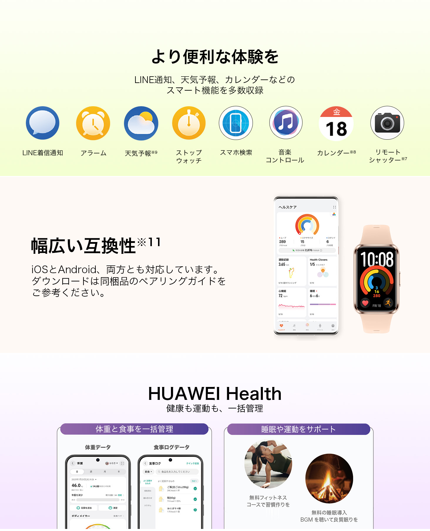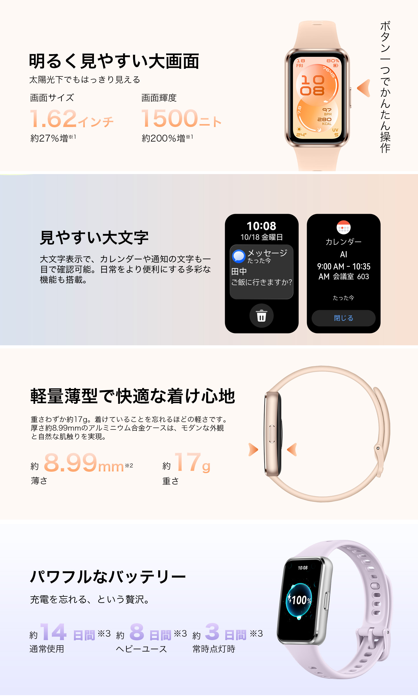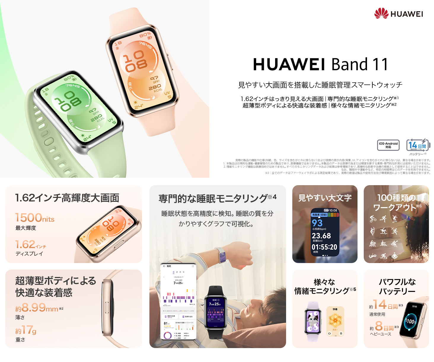 HUAWEI Band 11:約17gの軽量設計。1.62インチの大画面AMOLEDと最大1500ニトの輝度を搭載し、手軽に健康管理やスポーツを楽しみたい方に最適です。