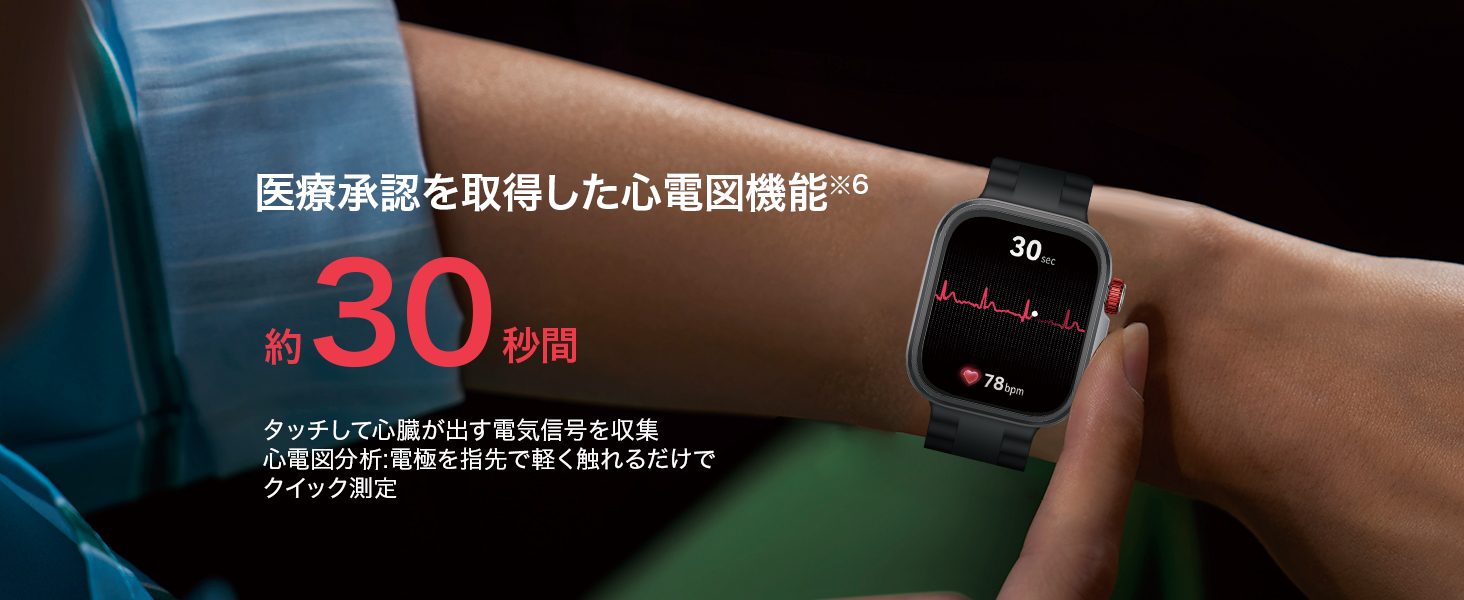 心電図の測定:ウォッチを手首にぴったり装着し、ウォッチ上で心電図アプリを開き、指を下ボタンの電極に軽く触れると、測定が開始されます。測定に関する注意事項等はHUAWEIの公式サポートでご確認ください。