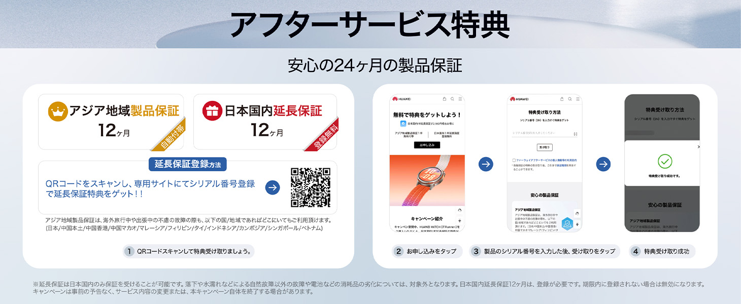 2)保証: 標準で「アジア地域製品保証(1年間)」が付帯します。さらに、受取後30日以内に公式サイトでシリアル番号を登録すれば、日本国内での保証が1年延長され、合計2年間の長期保証を無料で受けることができます。