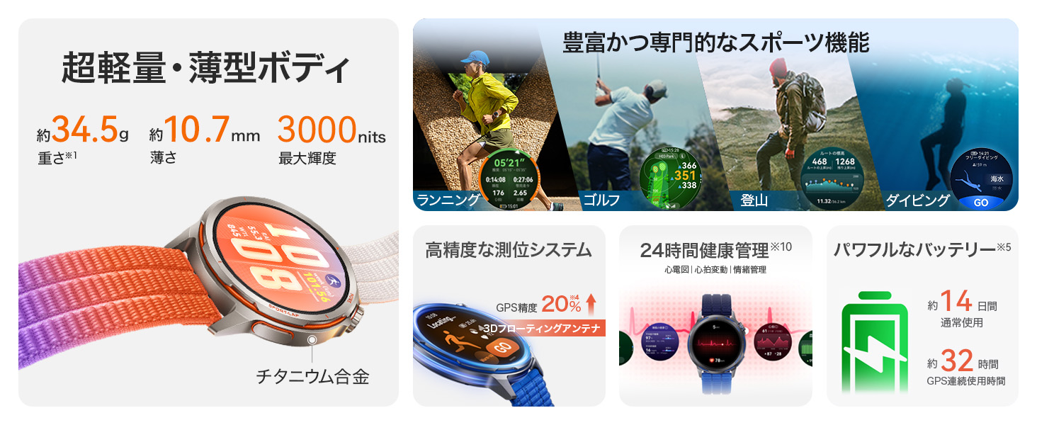 ランニングウォッチの常識を覆す汎用性を備えています。超軽量チタンを採用した高級感のあるデザインは、ゴルフや登山などのアクティビティにも最適です。もちろん、日々の健康管理機能も充実しており、スポーツからライフスタイルまで幅広くカバーするポテンシャルを秘めています。