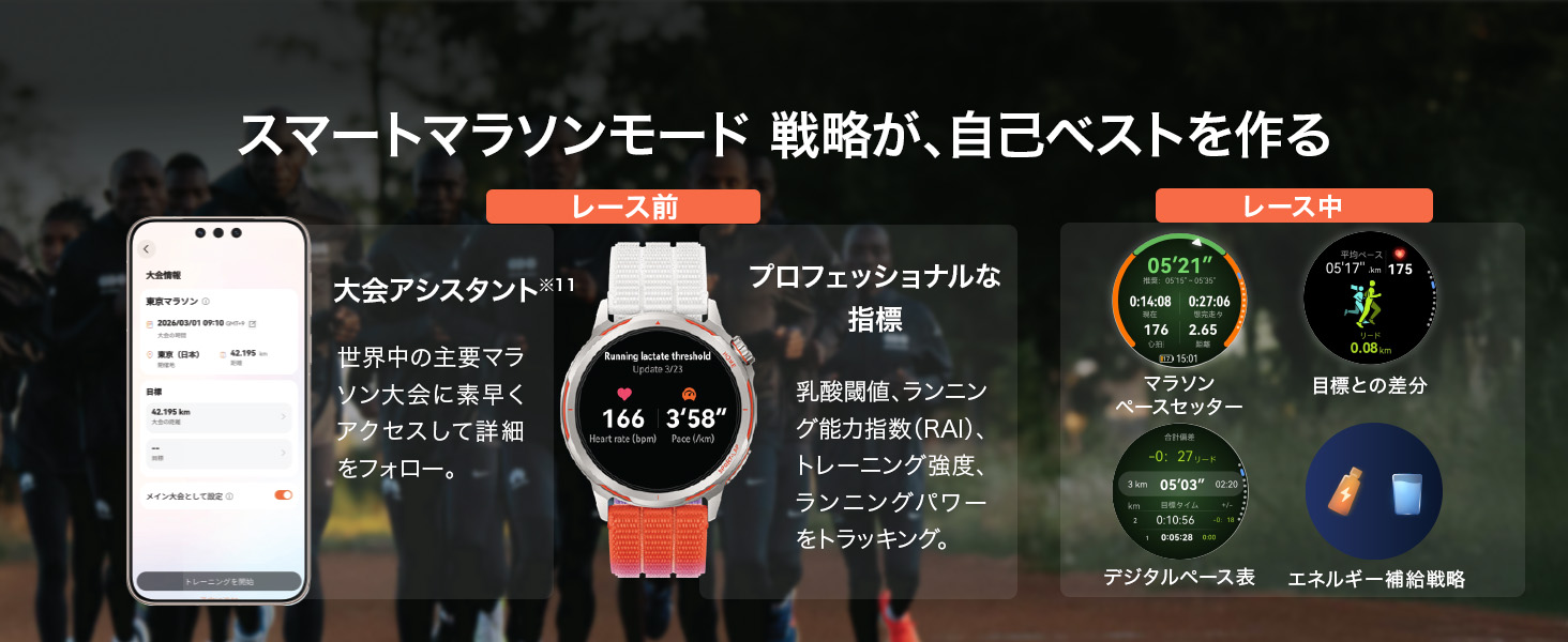 3)専用モードの搭載: マラソンモードや新しいトレーニングプランを搭載し、レースペースの管理から日々の練習計画まで、ランナーをトータルでサポートします。