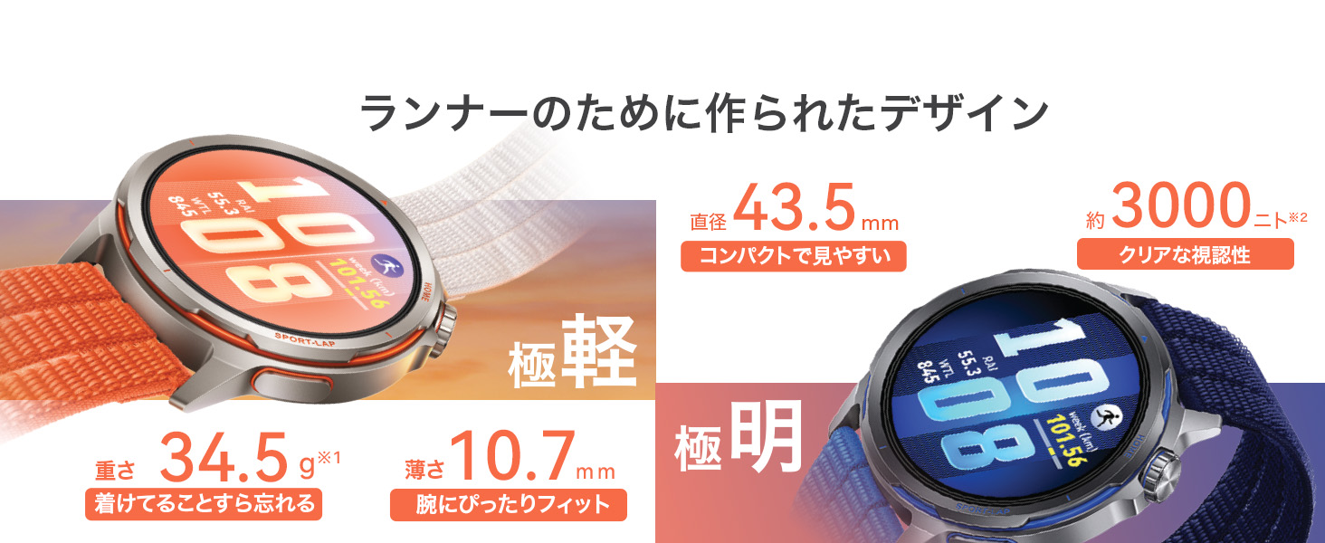 1)軽量化デザイン: 本体重量は約34.5gと極めて軽く、長時間のランニングでも装着感を忘れるほどの快適さを実現しました。