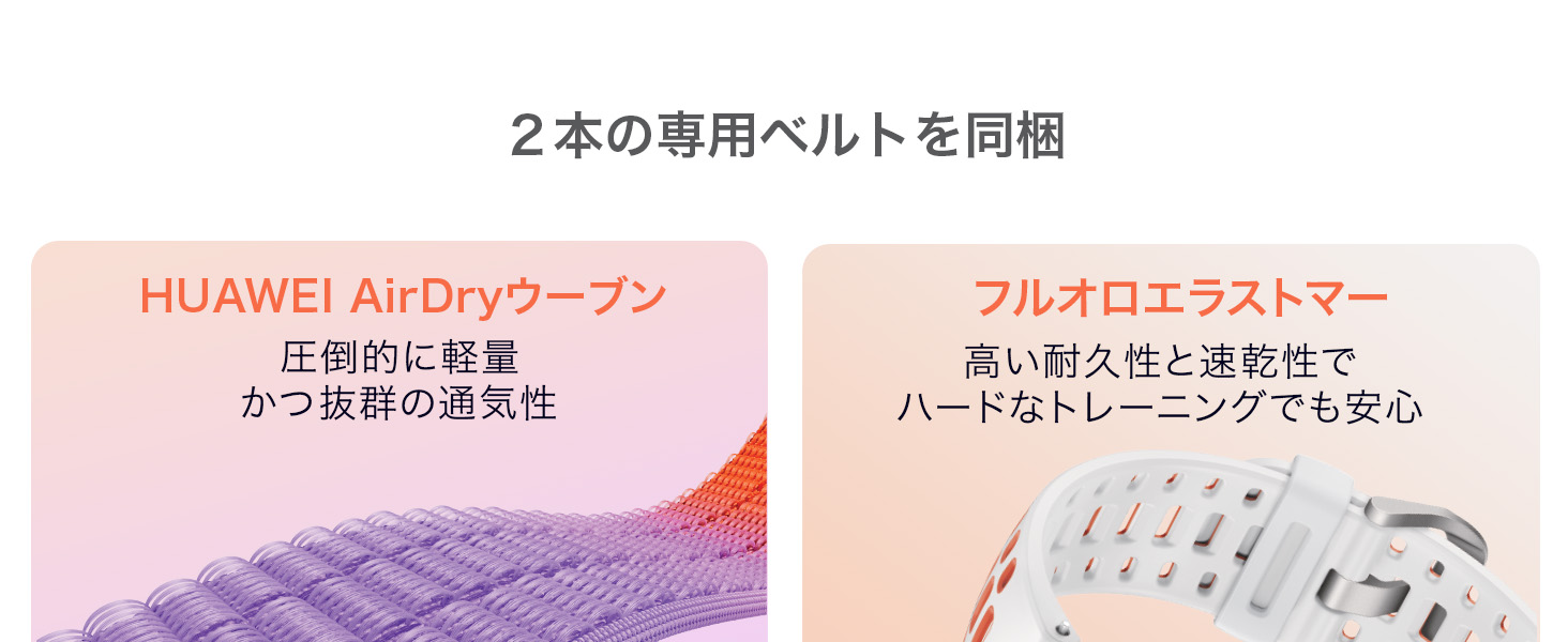 1)付属品: 標準のナイロン製スポーツベルトに加え、公式のフッ素ゴム製ベルトを1本同梱。シーンに合わせて付け替えが可能です。