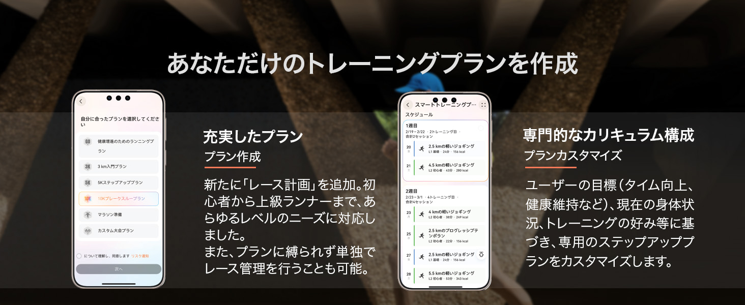 ユーザーの目標や過去のパフォーマンスに基づき、インターバル走、LSD(ロング・スロー・ディスタンス)、筋力トレーニングなどを含むパーソナライズされたプランを自動作成します。