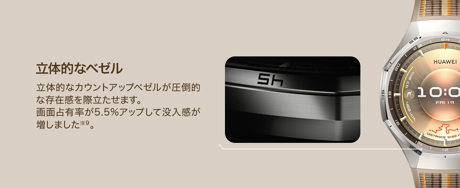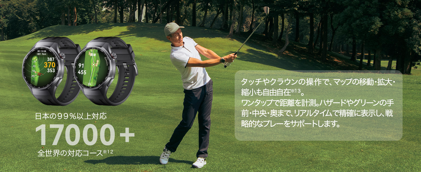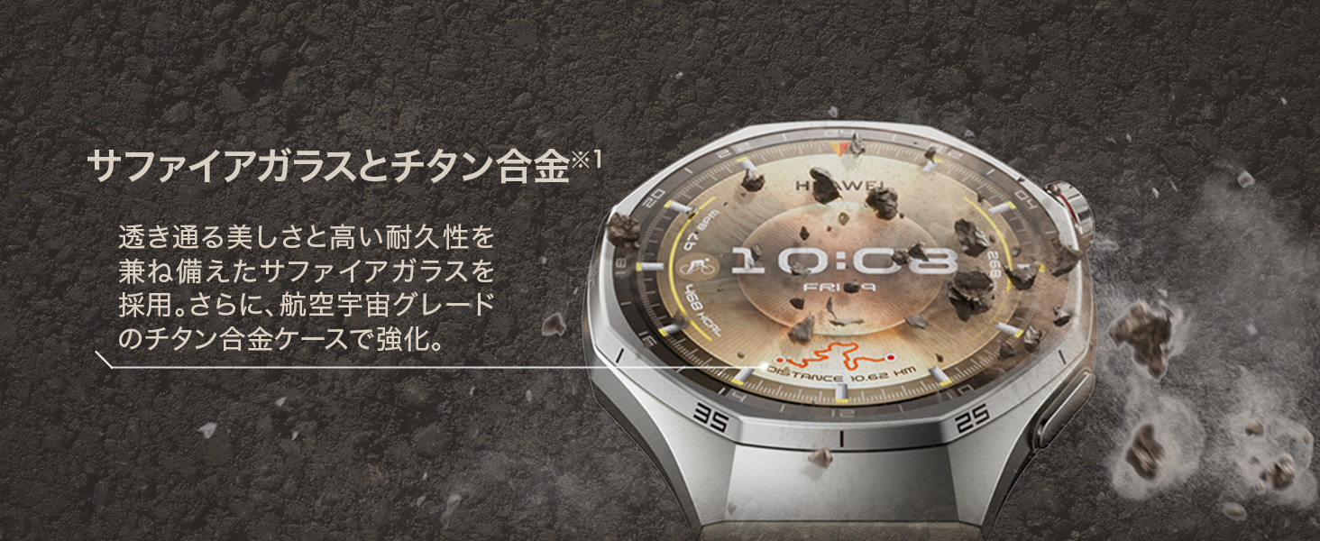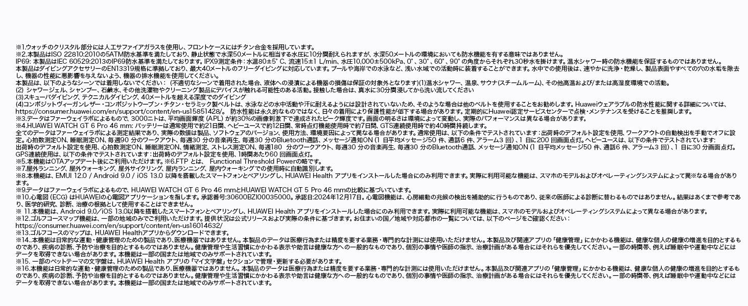 GT 6 Pro:GT 6 を強化したプロフェッショナル向けスポーツ機能を搭載(17,000以上のゴルフマップ、オフロードトレーニング対応)、サファイアガラス+チタンボディ、管理医療機器承認済みの心電図機能により、スポーツを楽しむビジネスユーザーに最適です。